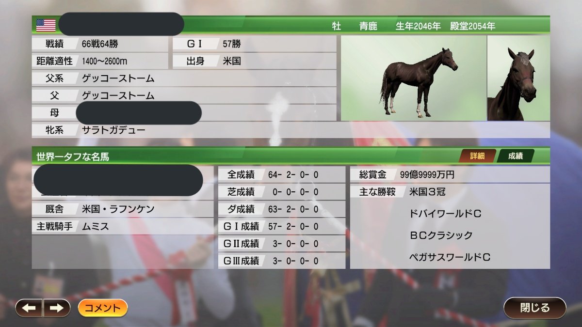 売りに出されてた史実種牡馬購入して史実期間超えて種牡馬させてると、狙ってもない訳分からない所で化物産まれて血統繋がったりする事偶にあって面白い。