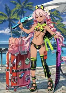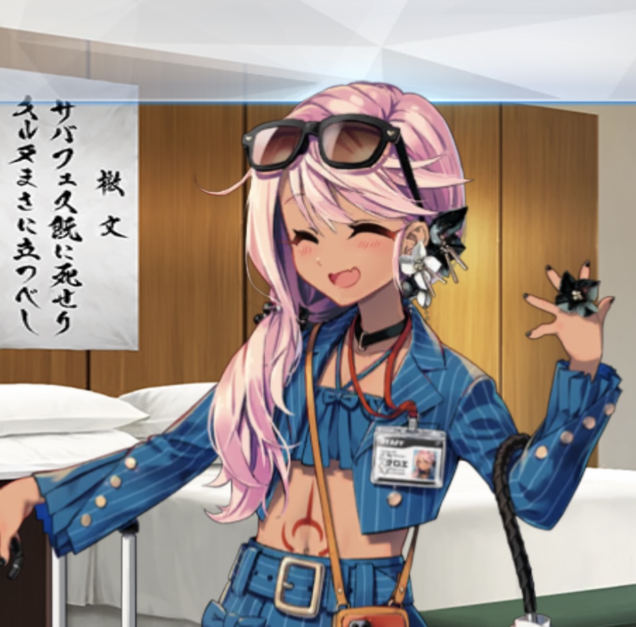 って挑発的な口調で紐を緩ませてマスターにお尻を見せつけるように突き出したら紐が(耐久的な)限界を迎えて褐色肌のお尻も大事なところも見せちゃって数秒後にヒモが解けてることに気付いて顔真っ赤になるクロと理性ケージ壊れそうになるマスター…!?