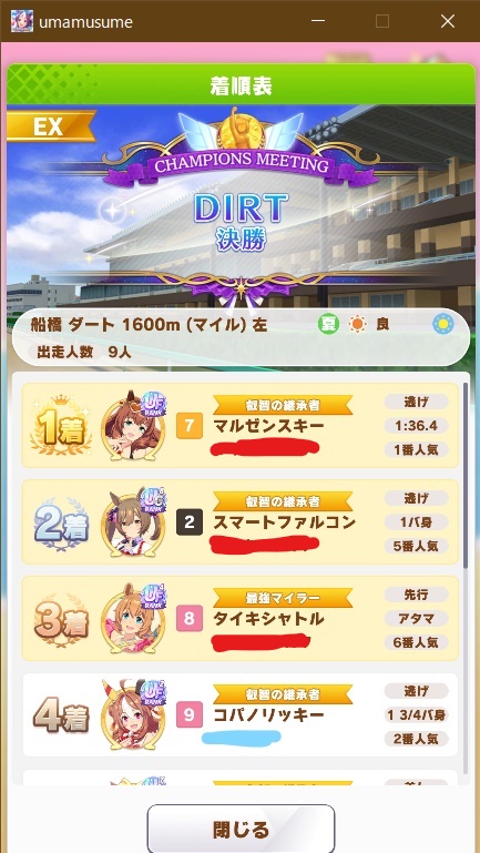 相手のUGウンス地固め無しにUFスズカがハナ取られて負けたり、あと大逃げ被り3回引いてる