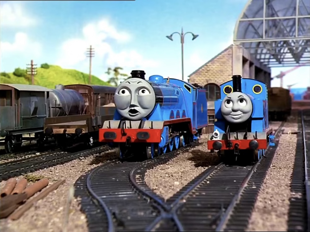 「僕はトーマス、列車を引っ張ってる。それにしても君の車輪、カッコ悪いねぇ。……僕はどこでも行きたいとは思わないね。線路が好きなんでね!お生憎様〜!」