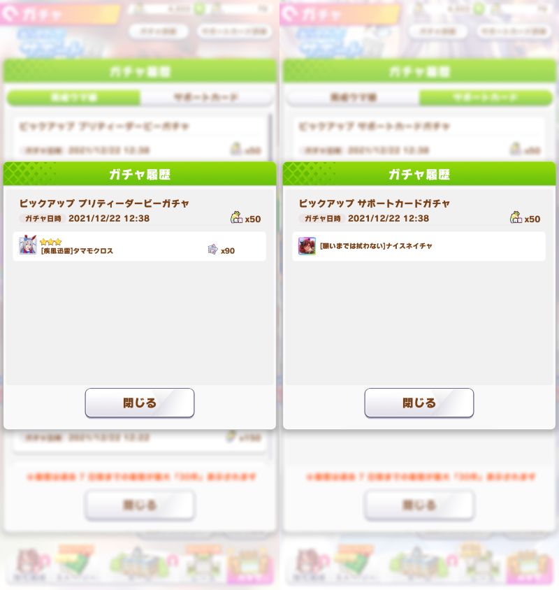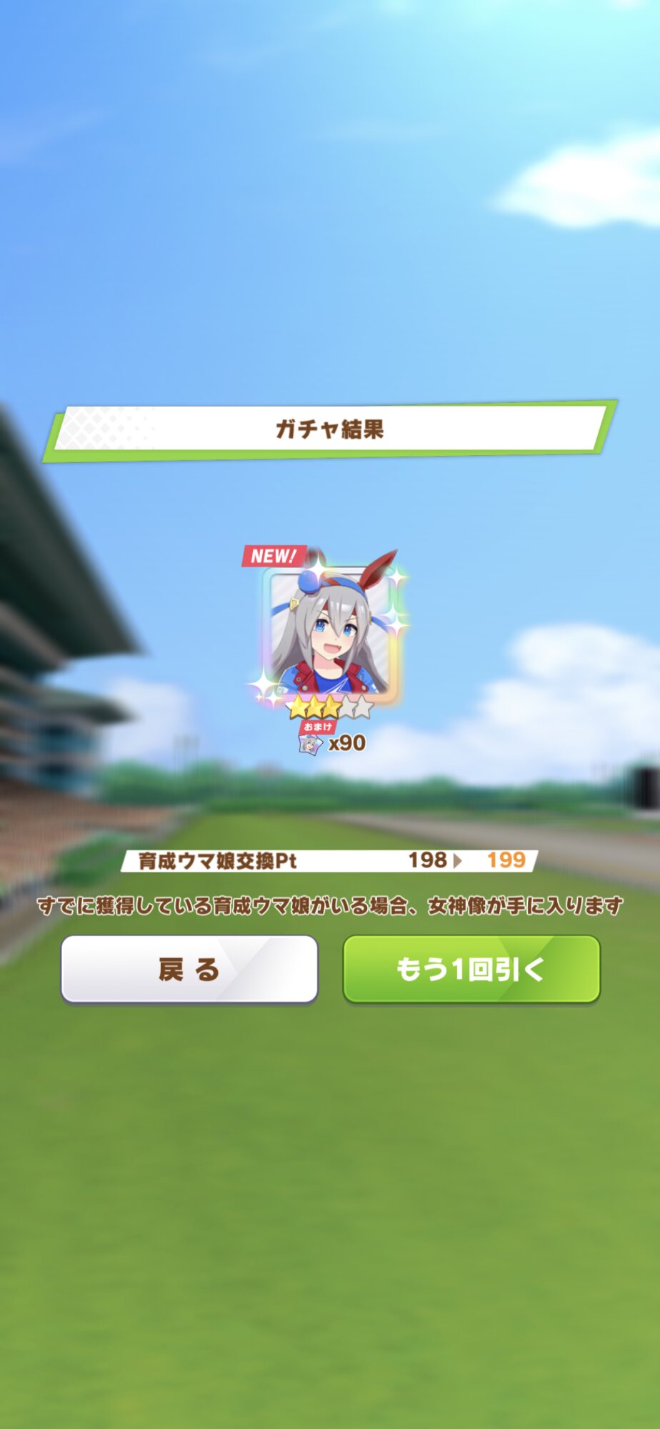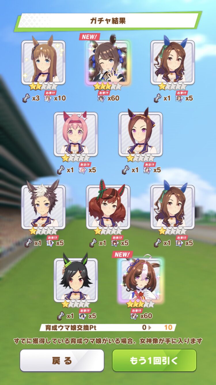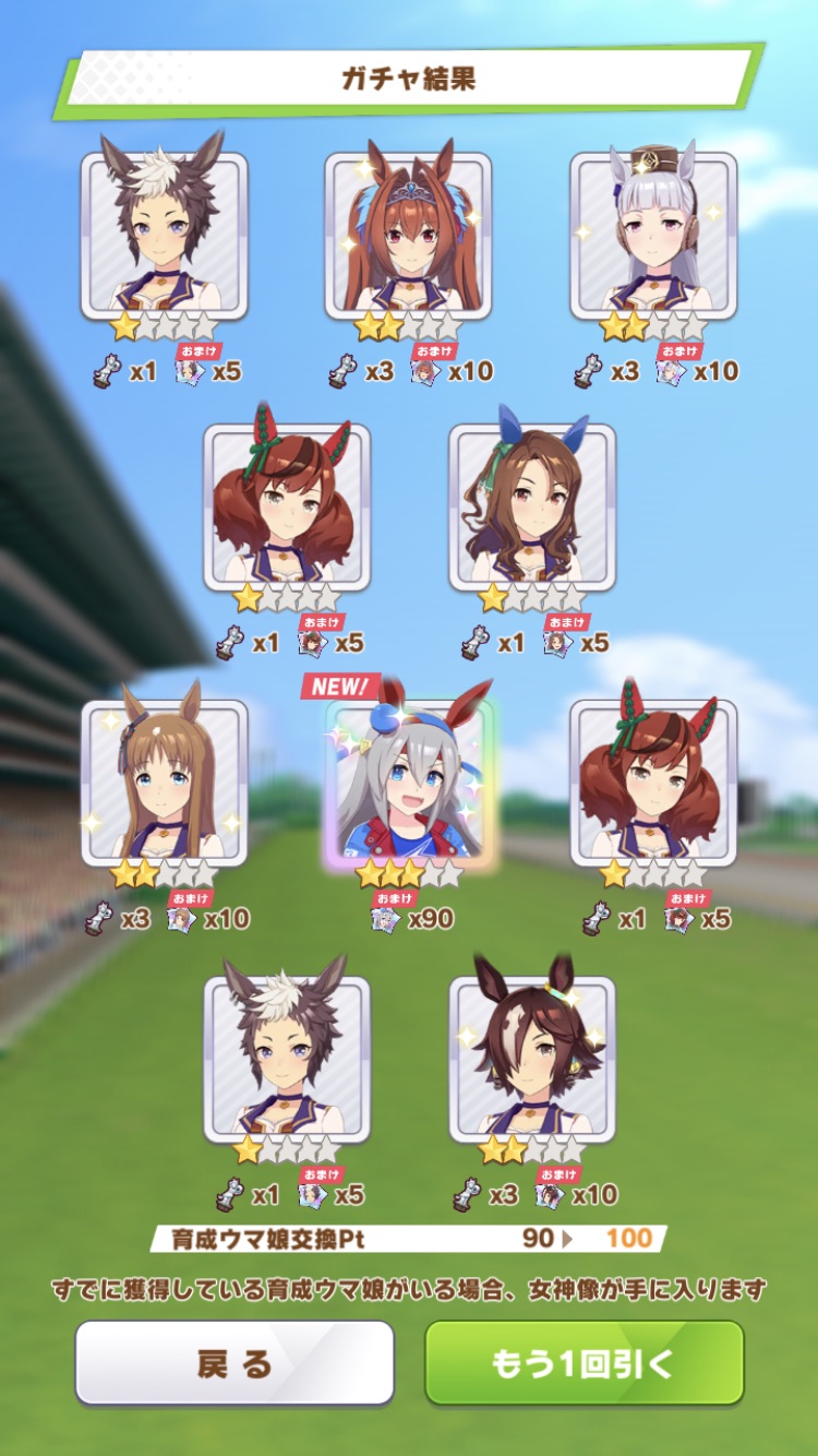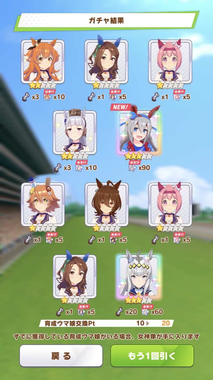 でな?次にドトウ天井した時は未所持は通常マルゼンとオペラオーが来て所持済みで確かモンクエルとヒーラーグラス来たんや