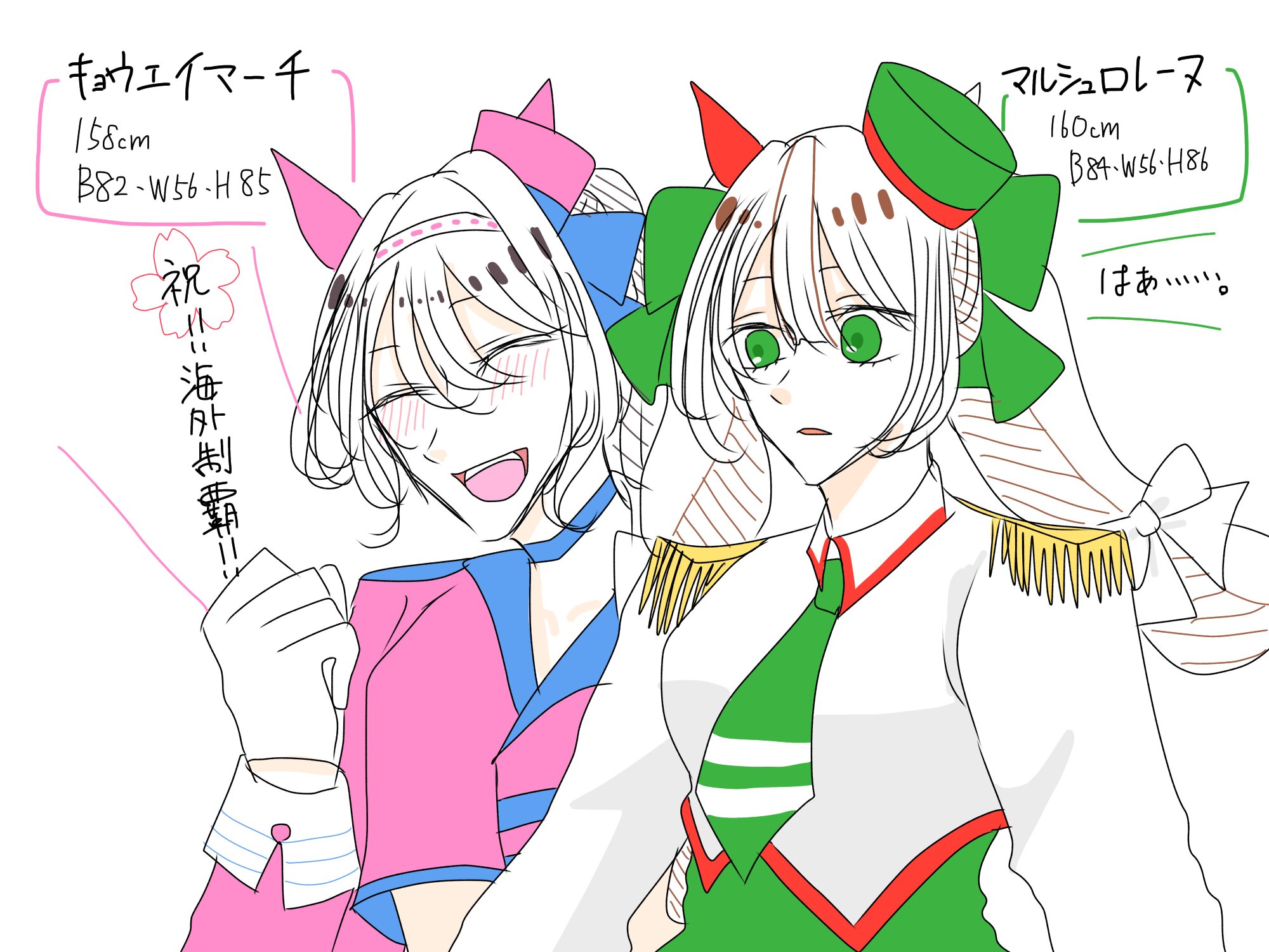 ハナズ→チューリップ賞勝ちなので🌷の装飾。オレハマッテルゼの色合いも入れたかったので瞳の色は緑です