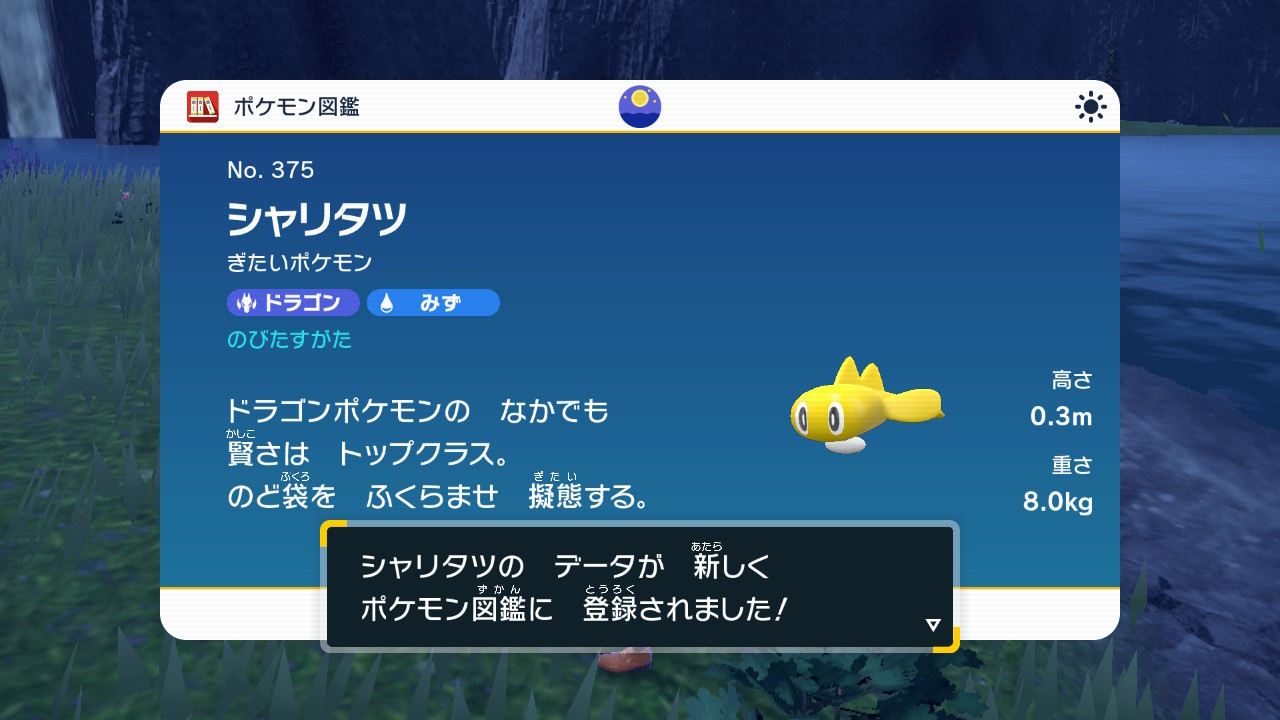 あとこの可愛いシャリタツっていう子、3種類くらいいるんだね!てことは色違い合わせて6種!?手持ちでぴったり揃えられる感じか!黄色い子可愛い、ピンクの子もなかなかよかったけど、この黄色い子が個人的に一番刺さる