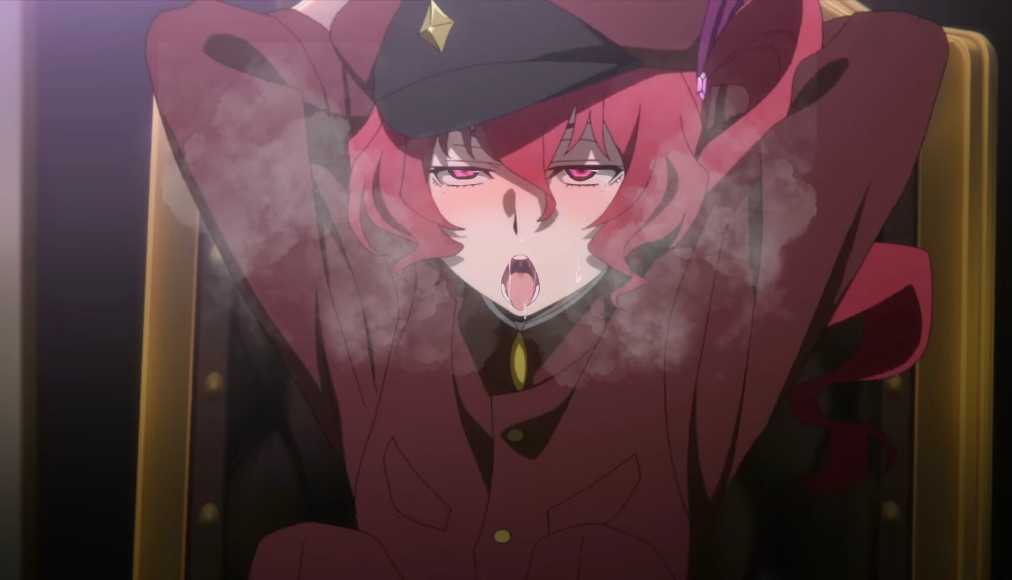 本来ならば政府要人を招き入れ、宴を開くための大広間。猟犬の女王こと大倉てる子は淫猥な踊りを晒していた。両手を頭の前に晒し、腰を前後に振る、まるで娼婦のようなそれ。立場を示す昏い赤の制服は下だけ脱ぎ捨てられ、毛の一本も生えていない性器を晒していた。その秘裂は蜜を溢れさせ、大理石の床を艶めかしく濡らし、その顔は恥辱と興奮で歪められている。下腹部には桃色に光る印が刻まれていた。それは、眼の前でてる子の醜態を楽しそうに眺める男の異能だった。印を刻んだ人間の身体の主導権を握るというもの。人質を盾に、印を刻んだ男がてる子に下した命令は一つ