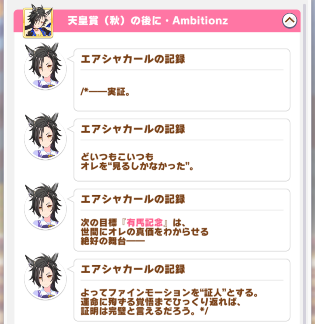 アヤベさん(史実で実際に宝塚記念の出走を目指していた)が宝塚記念に出るって言ったら「私も出たいです」って出走を決めて、宝塚記念前に「私一人だったら無理だったかもしれない」みたいなセリフもあったので