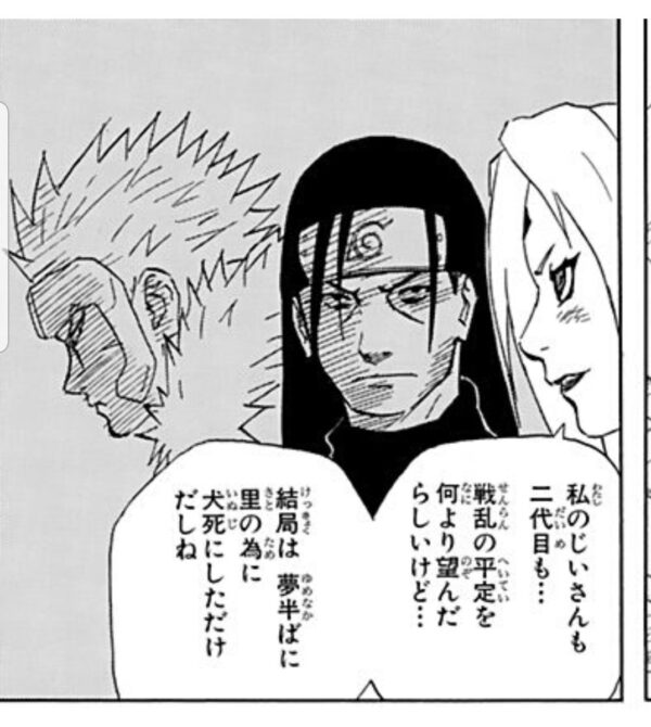 里の為に死んだなら犬死にではないだろう…と言いたいけど、綱手からしたら可愛がってくれたおじいちゃんと大叔父さんだから、身内の情としてはそれでも生きてほしかった、だと思うとやりきれないね