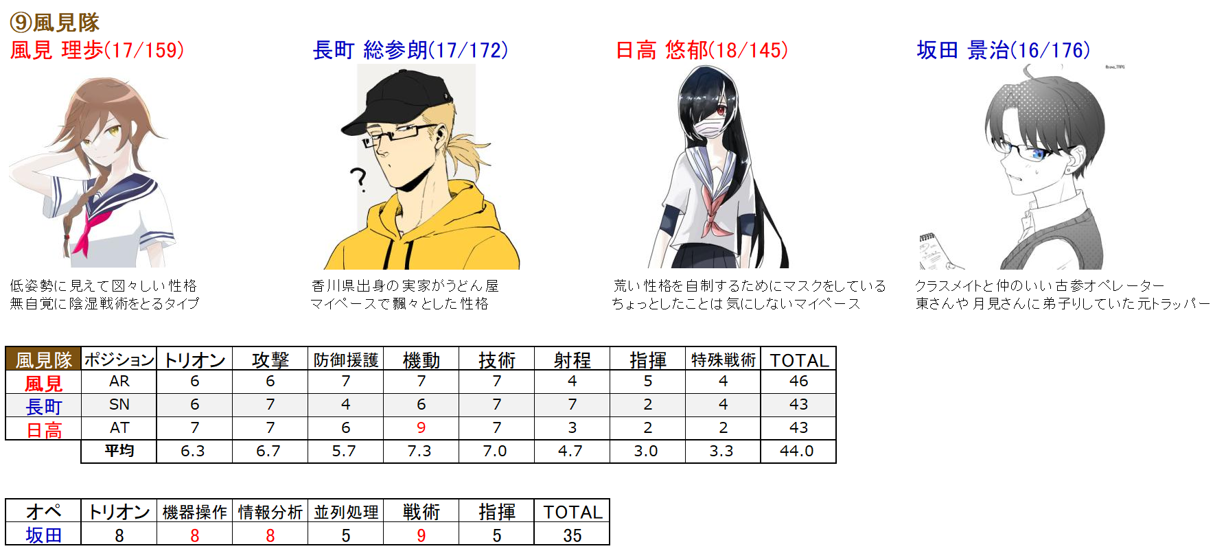 第三シーズン 鷲尾隊 - オリ隊員を作ってオリ隊の運用方法を考えるスレまとめ公式情報メンバー【隊長】鷲尾辰則(AR)【戦闘員】別役豹真(AT)【戦闘員】猫宮忍(AR)【オペレーター】長門有栖(OP)非公式情報・わくわく動物部隊(※ただし、攻撃はトリオン以外にも効く)隊員全seesaawiki.jp風見隊