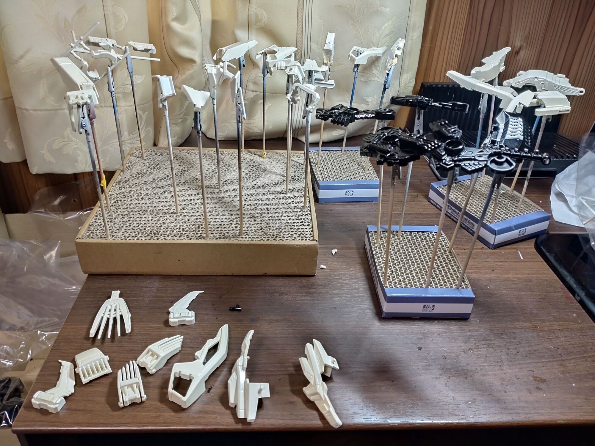 私の環境ですが、ダンボールの手前をくり抜いて、天井に穴開けた後に透明アクリル板貼り付けた(=光をとり入れる)手製塗装ブースで塗ってます。