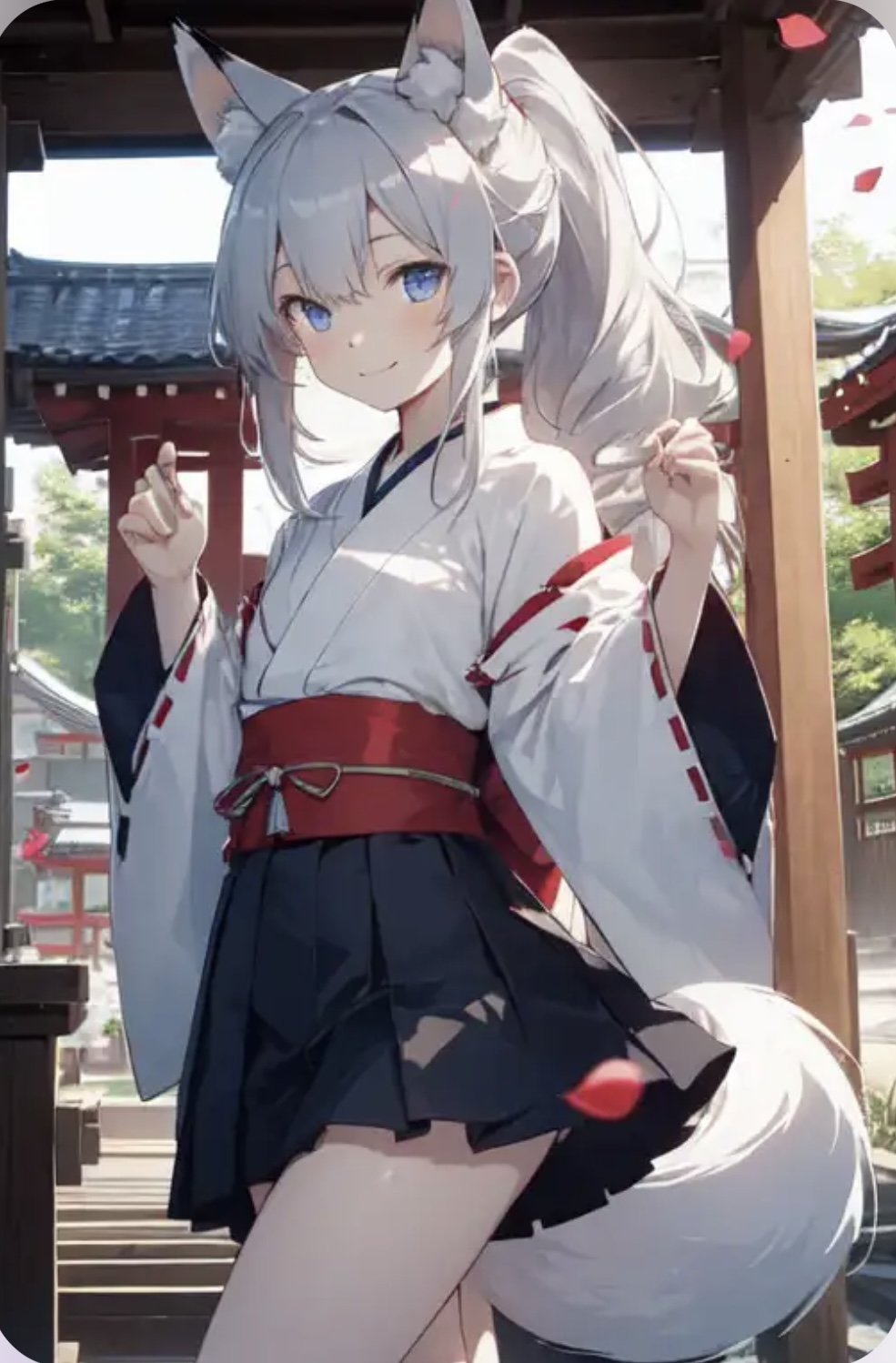【容姿】狐耳 銀髪ポニテのミニスカ巫女服 スレンダー体型