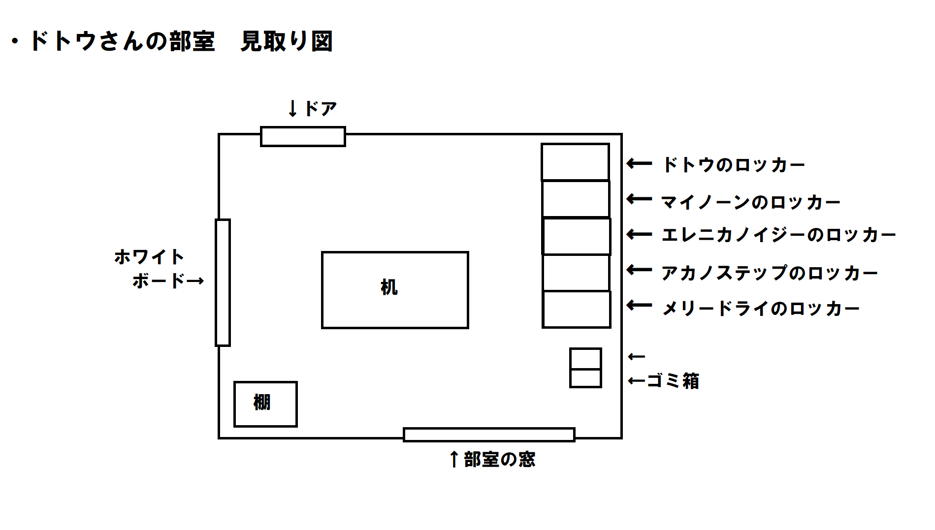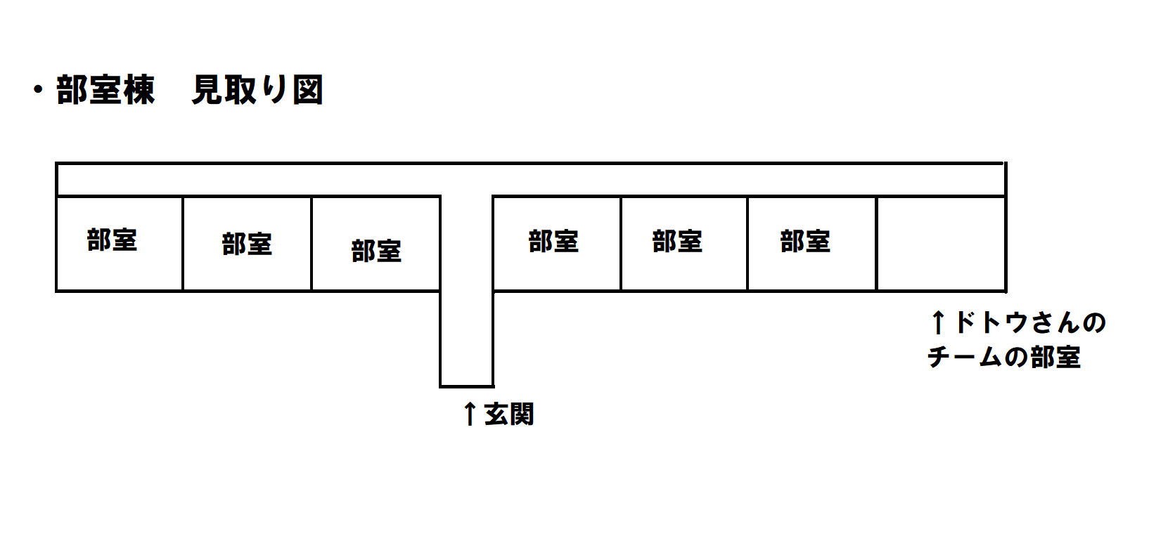 ドトウさんのチームの部屋が割り当てられた部室棟は、大まかに言えば長方形に広がっていて、その真ん中に玄関があるT字型の建物。スペシャルウィークさん達の部室とは打って変わって、トレーナー寮とグラウンドを挟むような位置にある。部室棟の見取り図はこんな感じね。 - 3◆.SBffrpxUgai23/10/14(土) 11:14:18