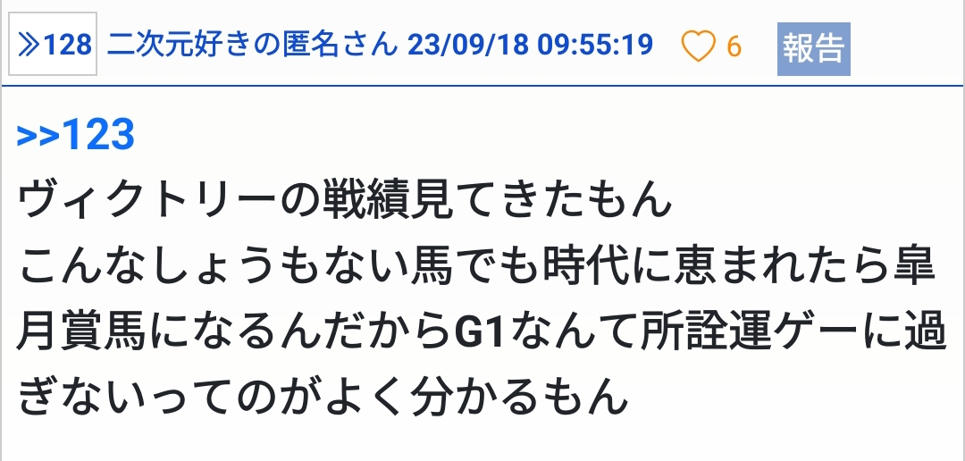 良くも悪くもクラシック期以外語る事が無いしIFを見たい馬かと言われると - 72二次元好きの匿名さん23/10/18(水) 21:08:46