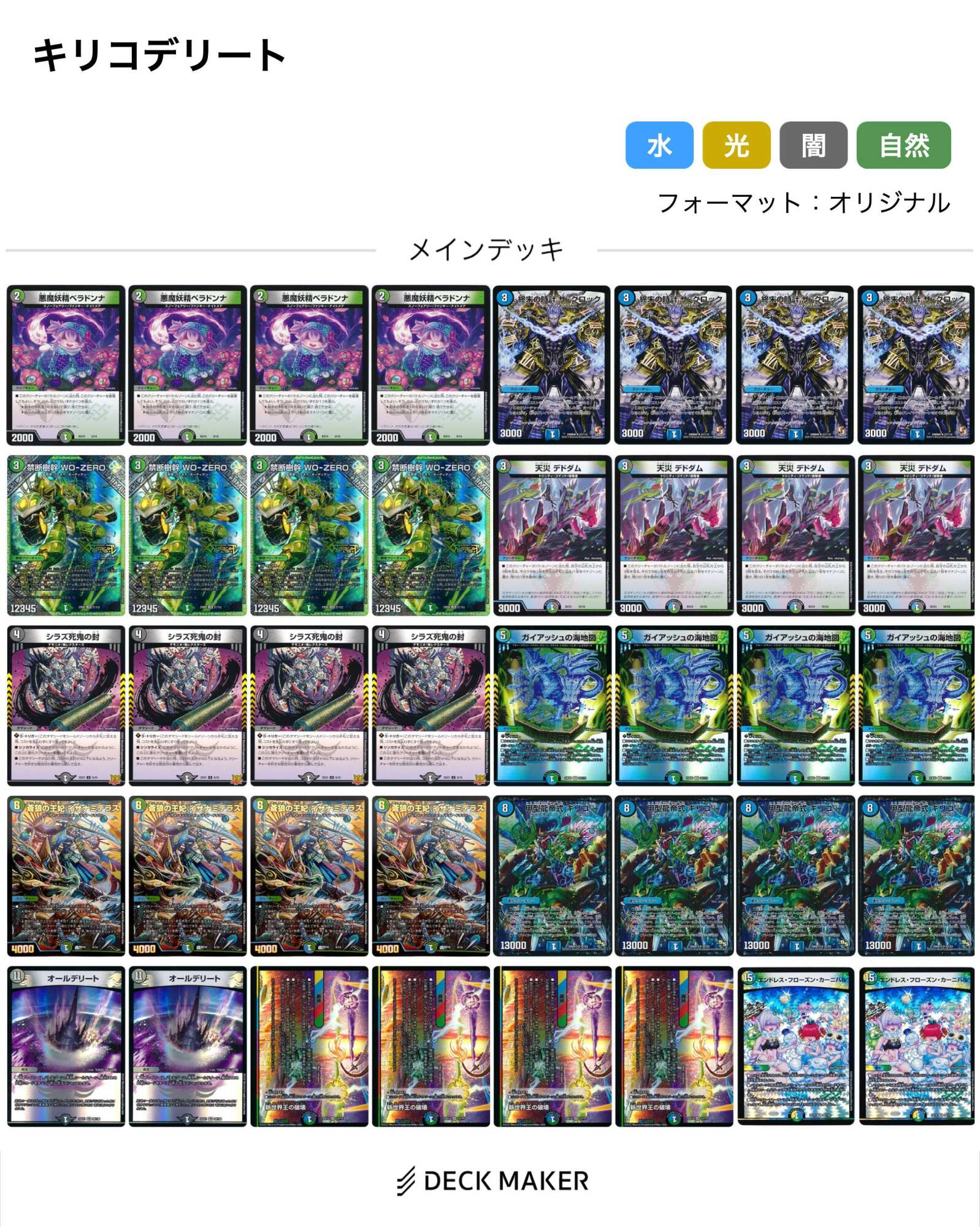 まだ揃ってないけどオールデリートエンドレス祭がそれぞれ2枚、後はベラドンナやデドダム、クロックと4枚、シラズシキも4枚でイザナミとWOとキリコ3とガイアッシュのビジョンも4枚のまだ安定感の欠けるデッキだよ