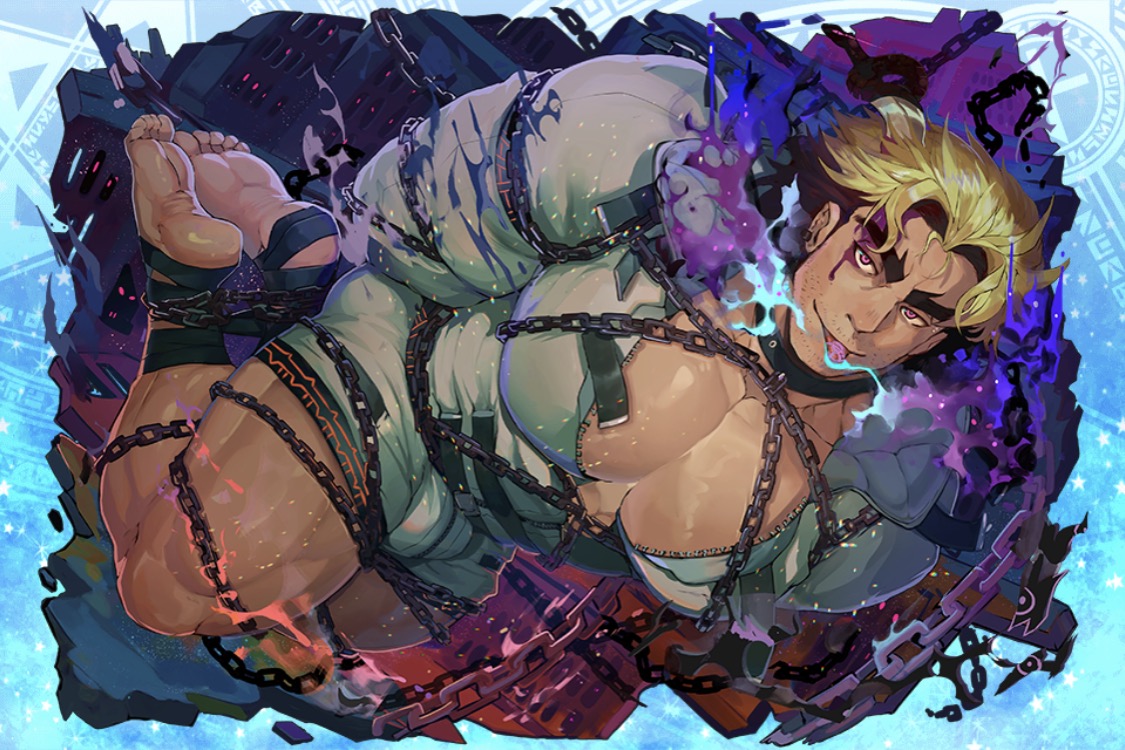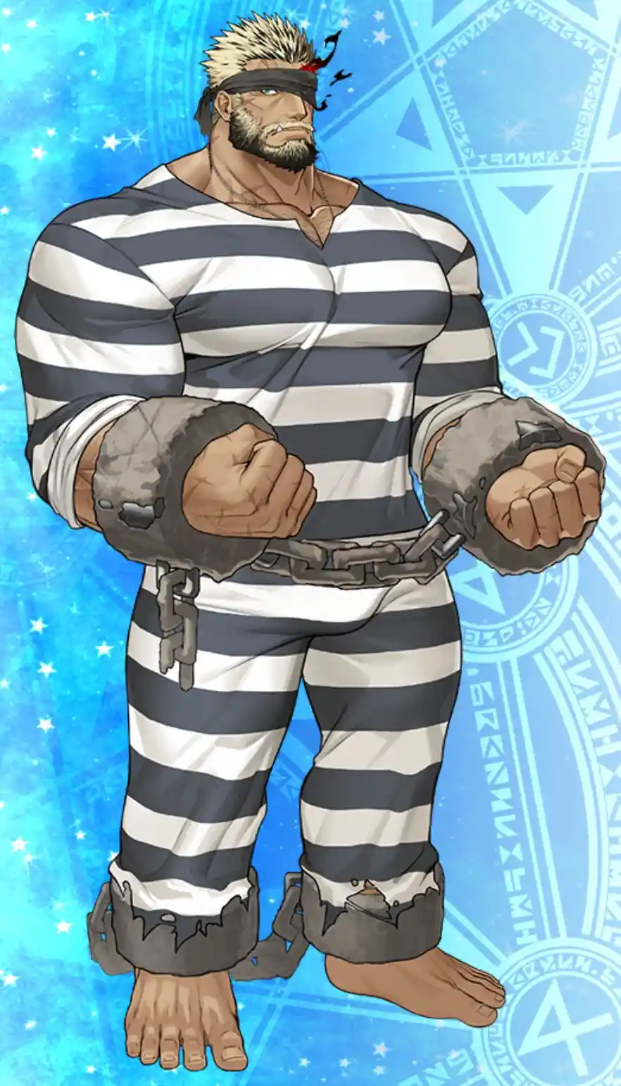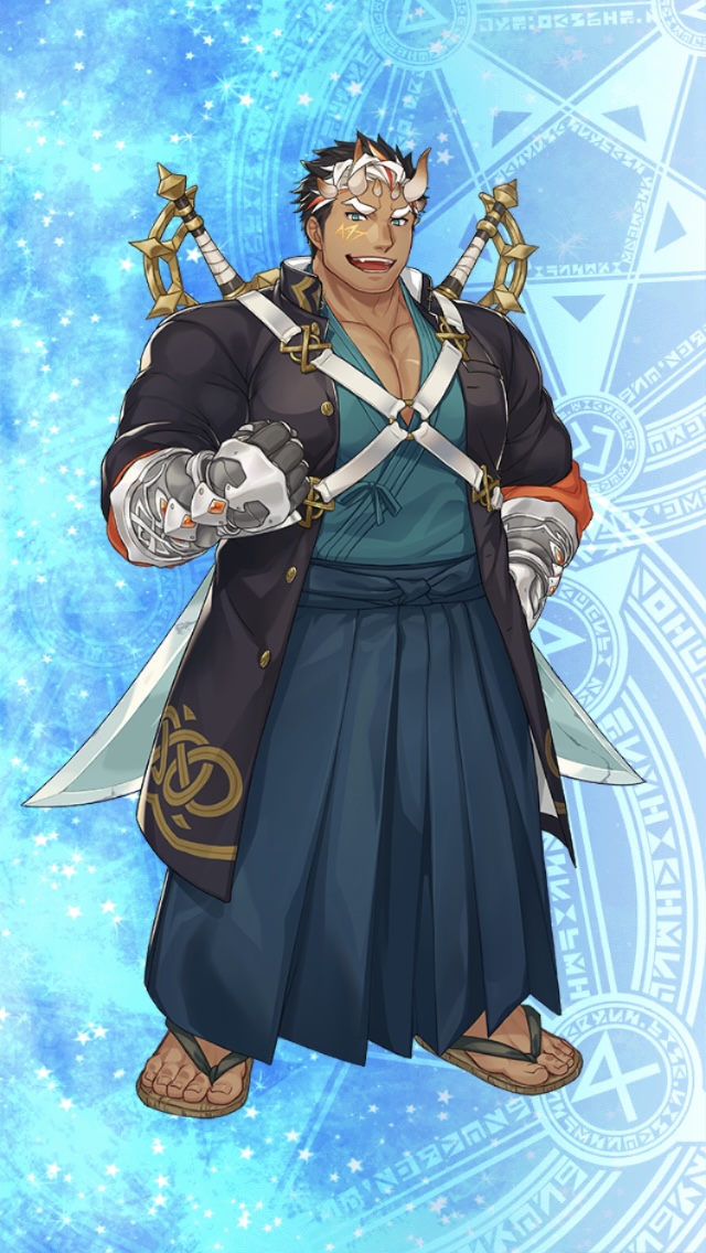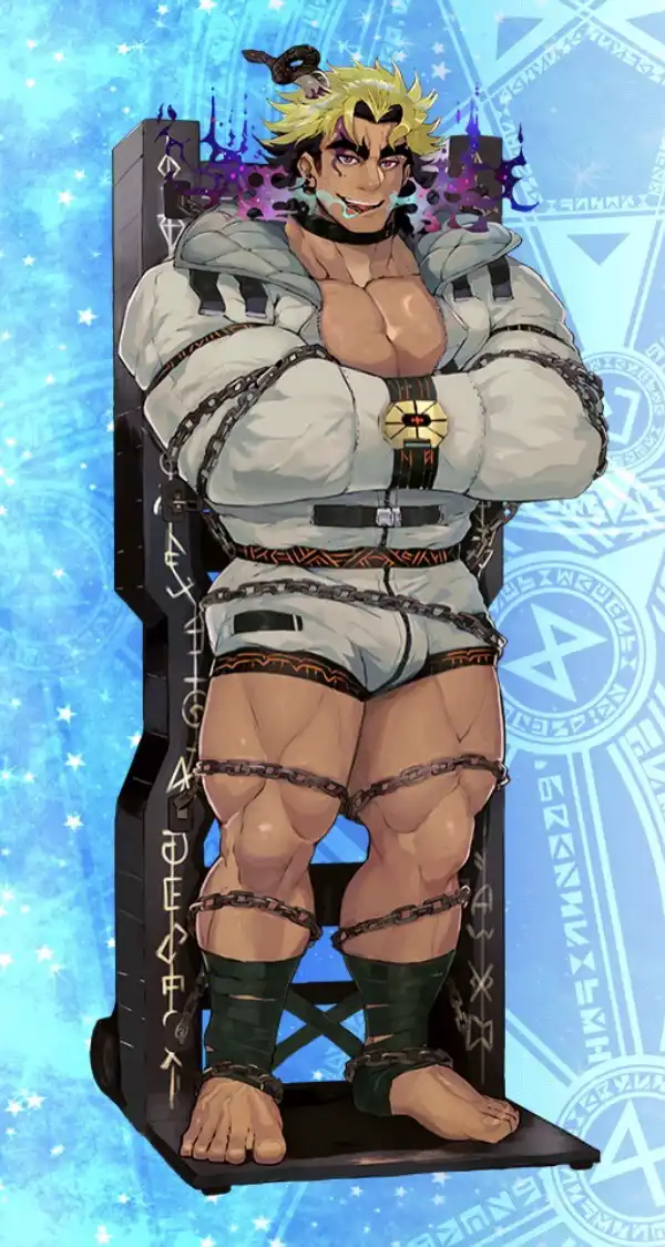 見た目に危険そう。彼もやはり危険視されてるから縛られているタイプの方なのか、原典で縛られた方なのか。しかし縛られても俺の心まで縛れると思うなよなどと思っていそうです。あと下半身をもっと隠してほしい。後ろの拘束具の文字はなんでしょうねこれは。ルーンに見えたけどただのそれらしい記号のようにも見えます。
