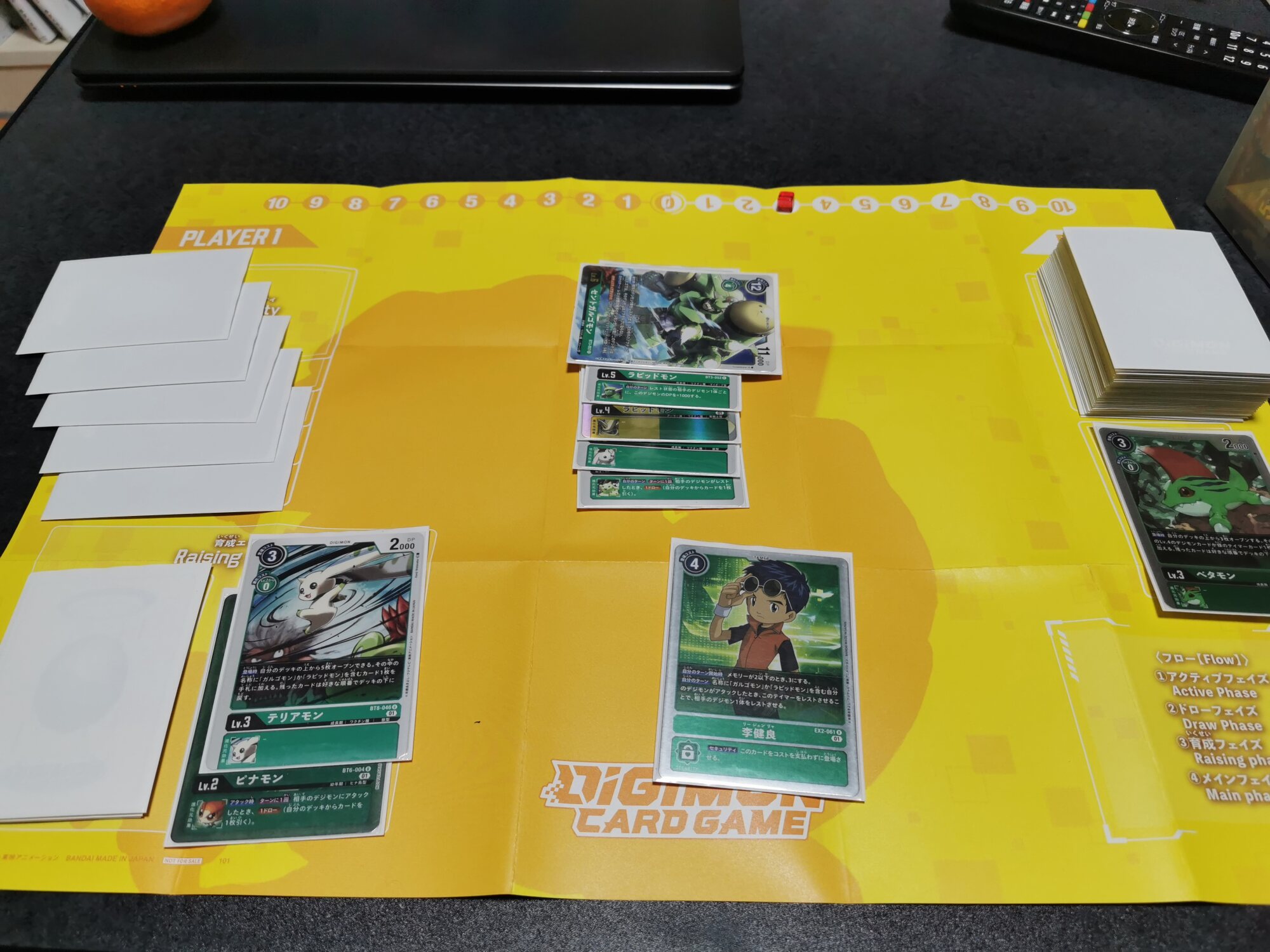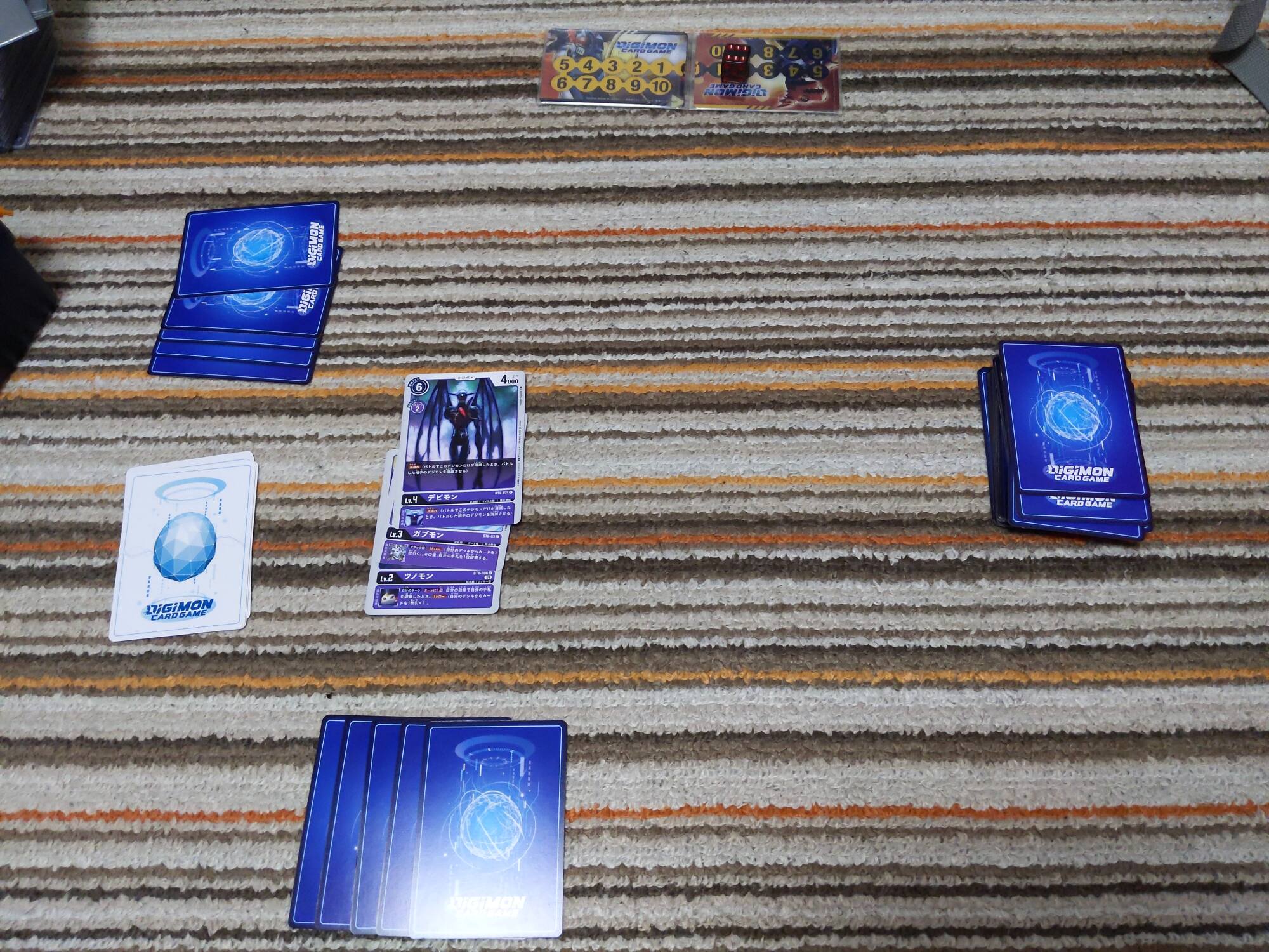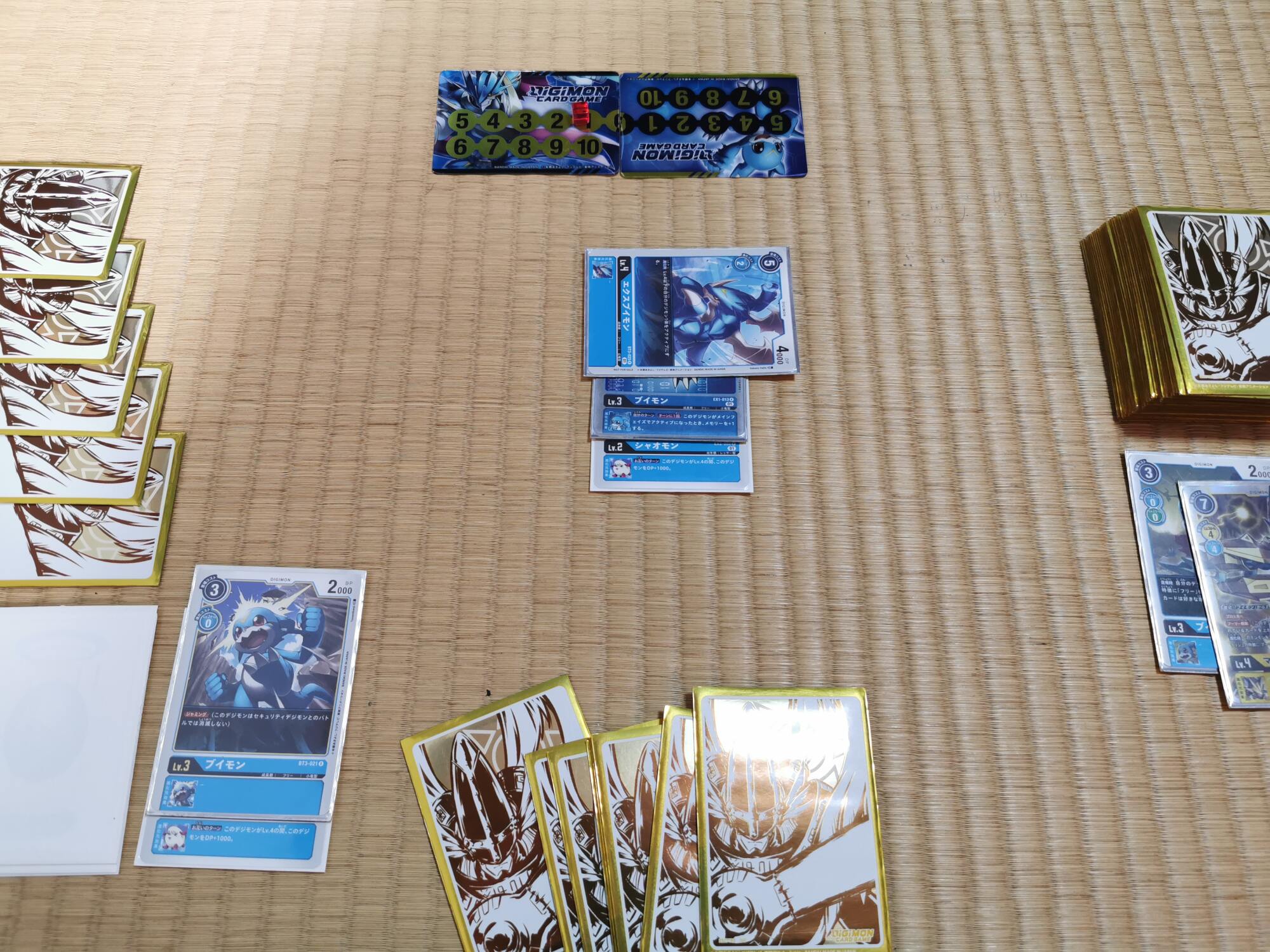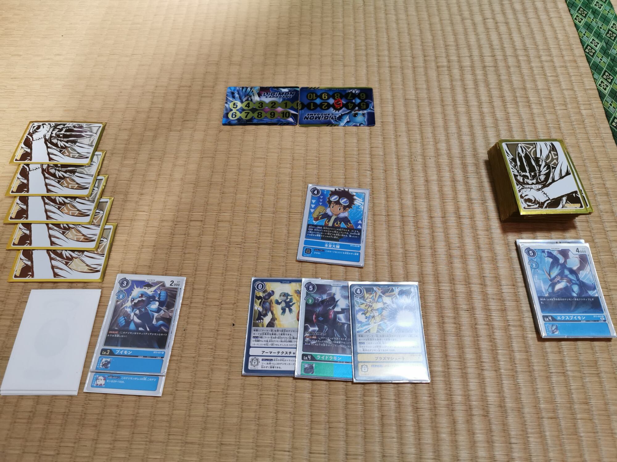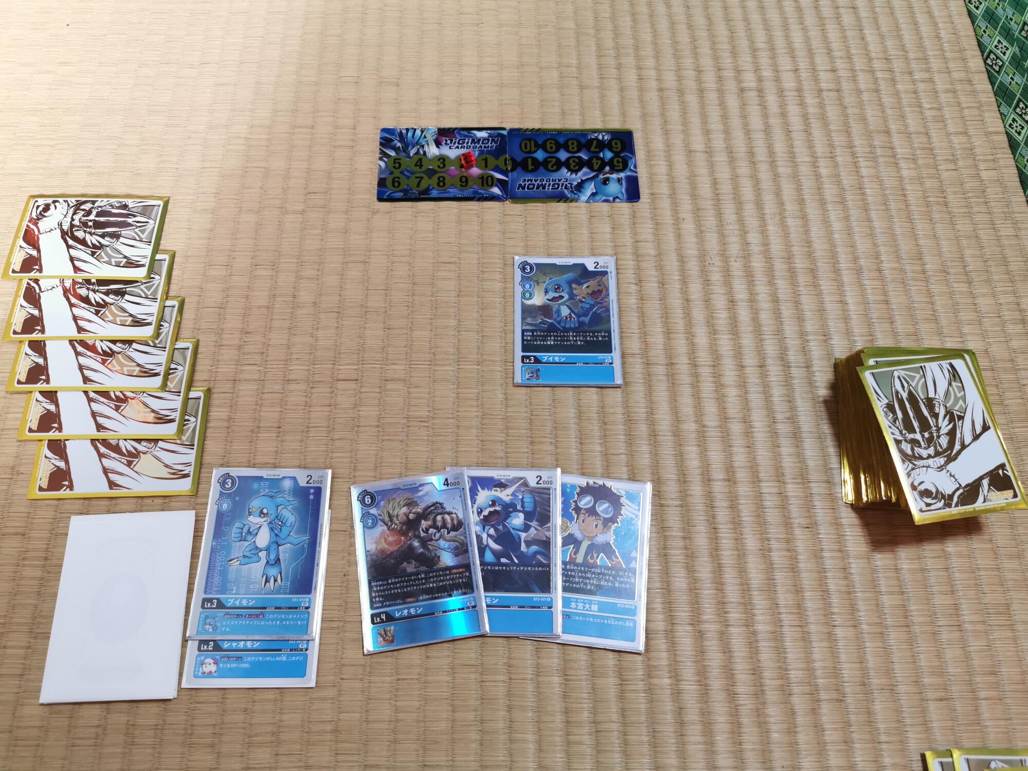 3コスでインプモンを登場、デッキを4枚オープンし、対象が無かったのでデッキの下へ