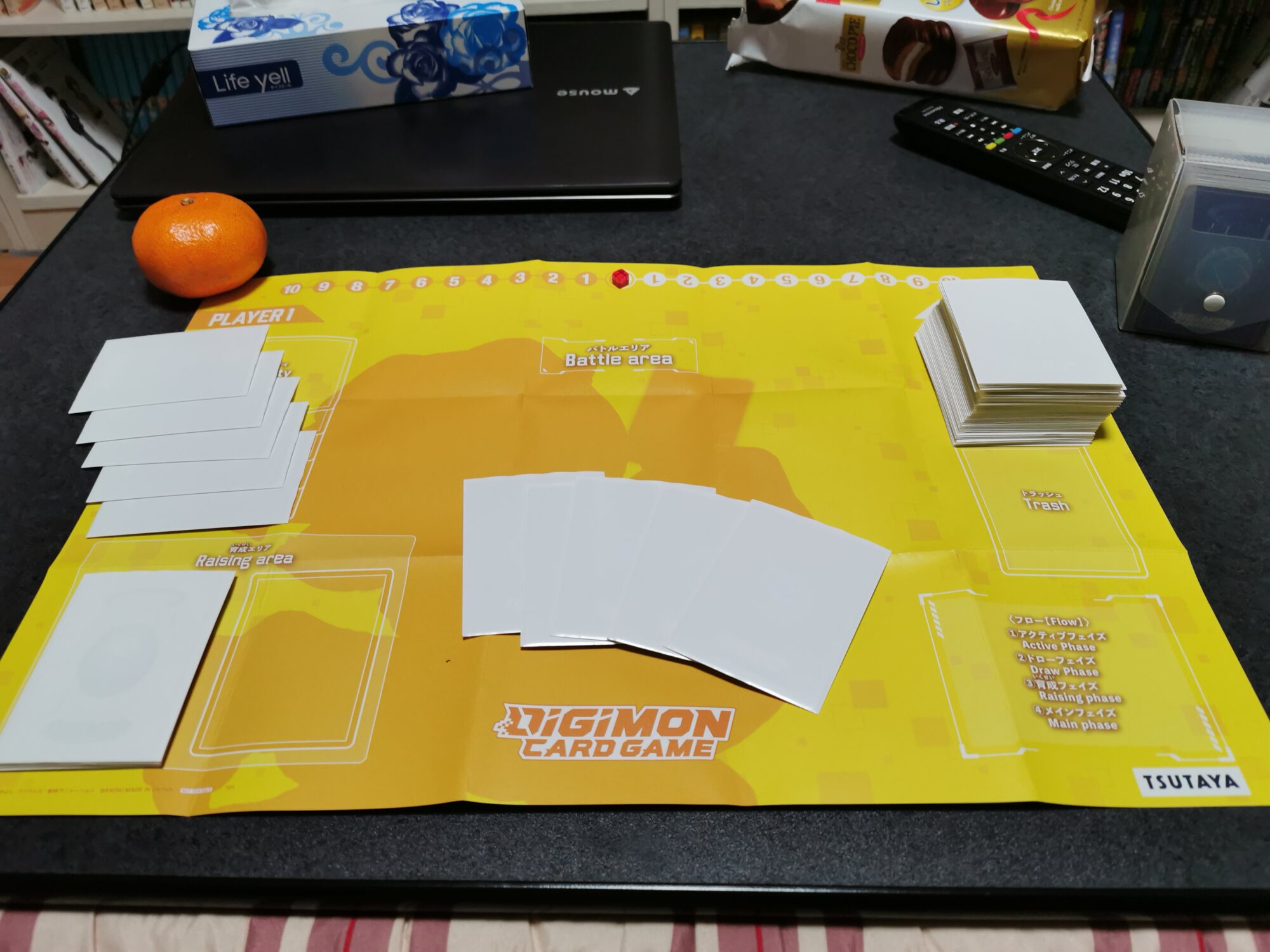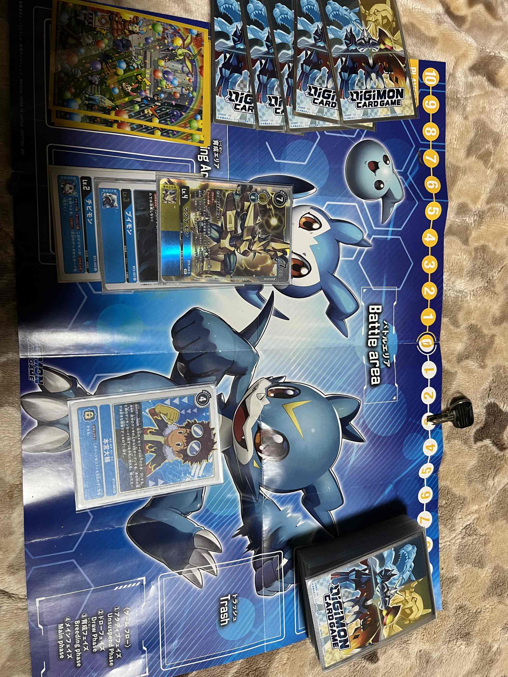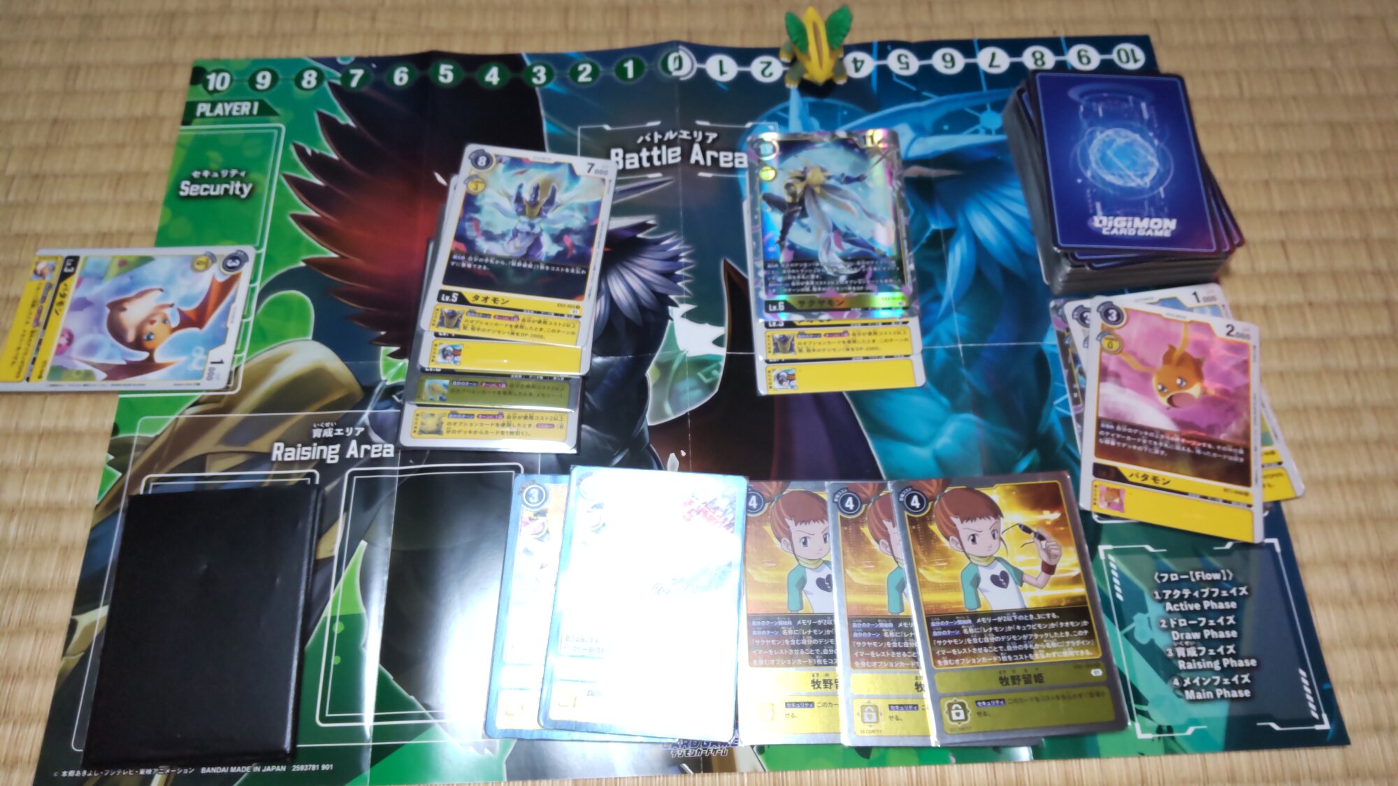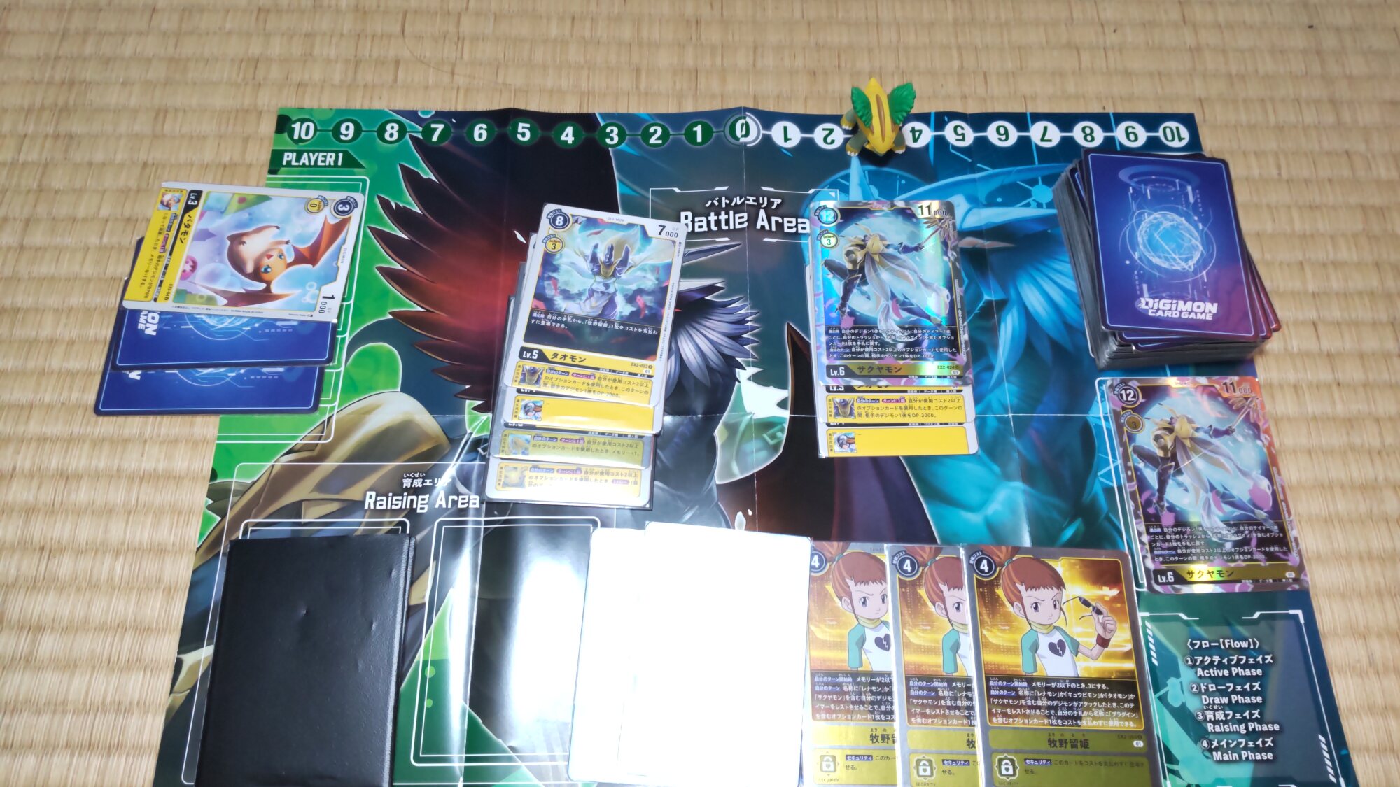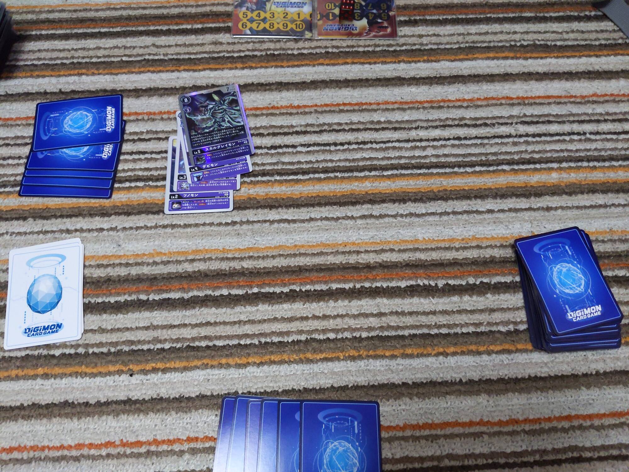 3コスでインプモンを登場、デッキを4枚オープンし、対象が無かったのでデッキの下へ