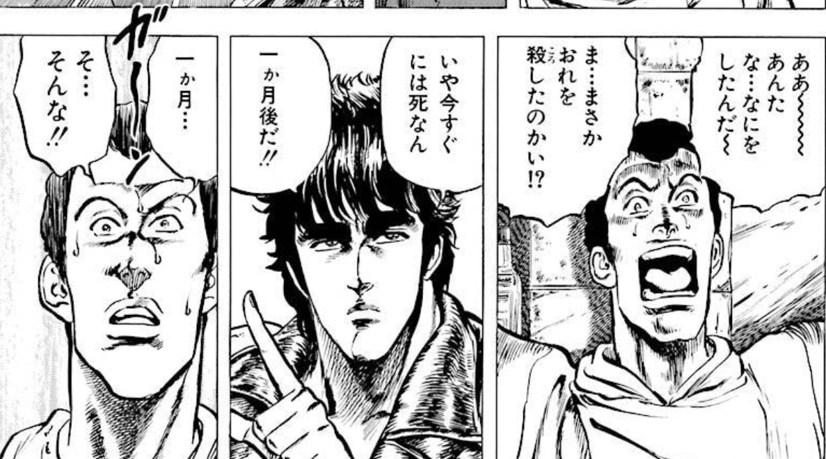 GOLANと戦いに行く時に村を滅ぼされた子供を酒場の店主に預けるために1ヶ月後に死ぬ秘孔を突いて自分が戻るまで世話しなければ解除しないって脅した事もあったし割と手段を選ばないとこある