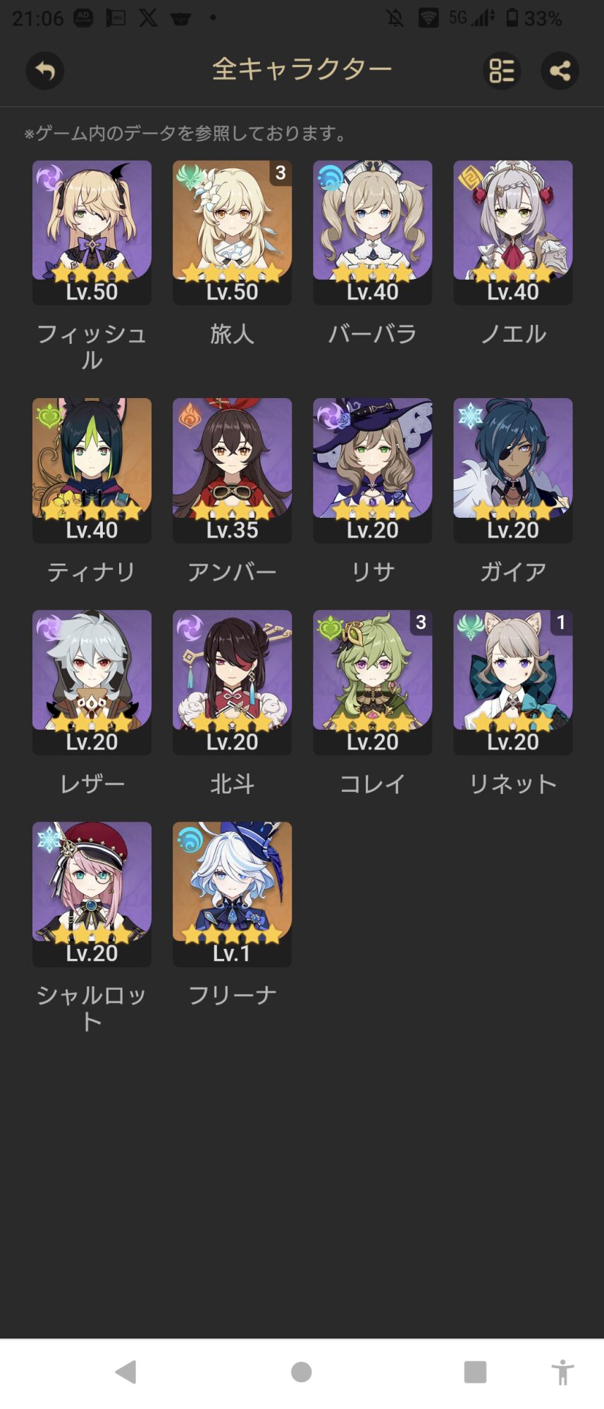 けど要所要所で主人公で戦ったり、主人公は扱う元素を変えられるんだけど草元素を扱う状態だと役割があったりするからレベルを上げても問題はない。優先順位は低いけどね