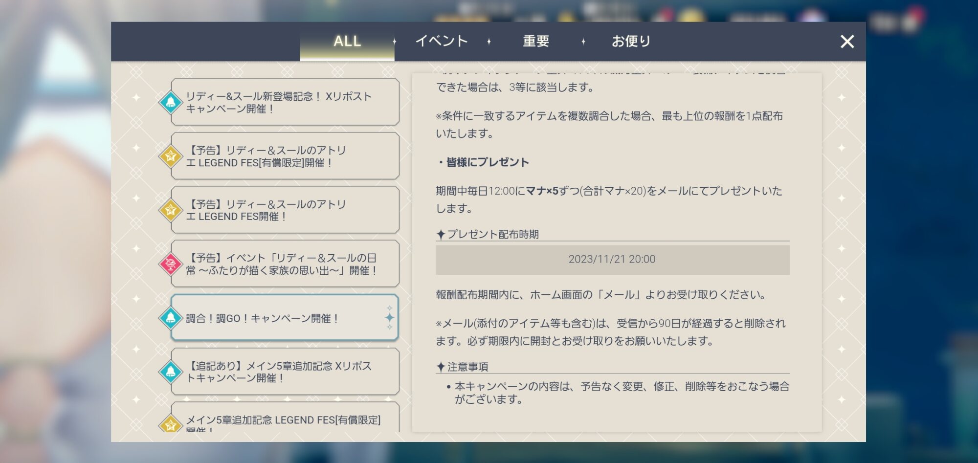 自分は自然回復分しか調合やってなかったからイベ来てからやれたけど事前告知して月初めくらいにやっていれば今の批判より少なかったと思う