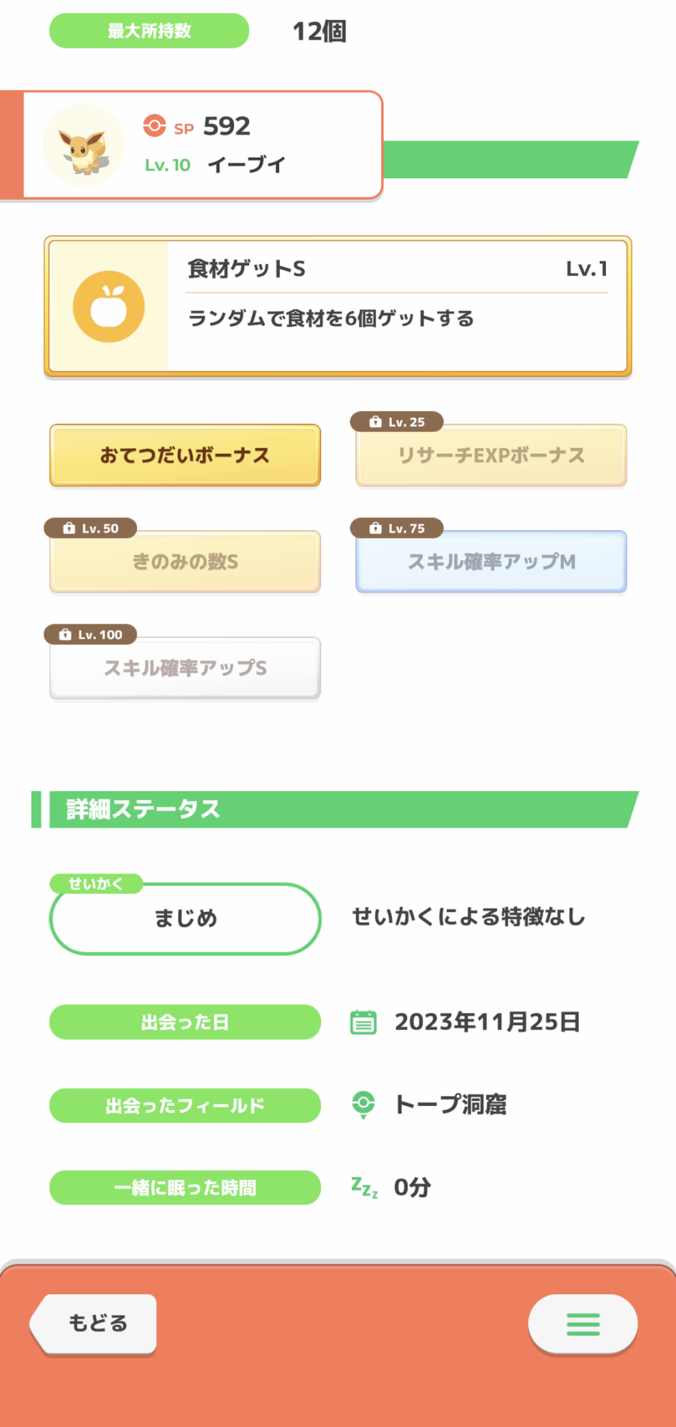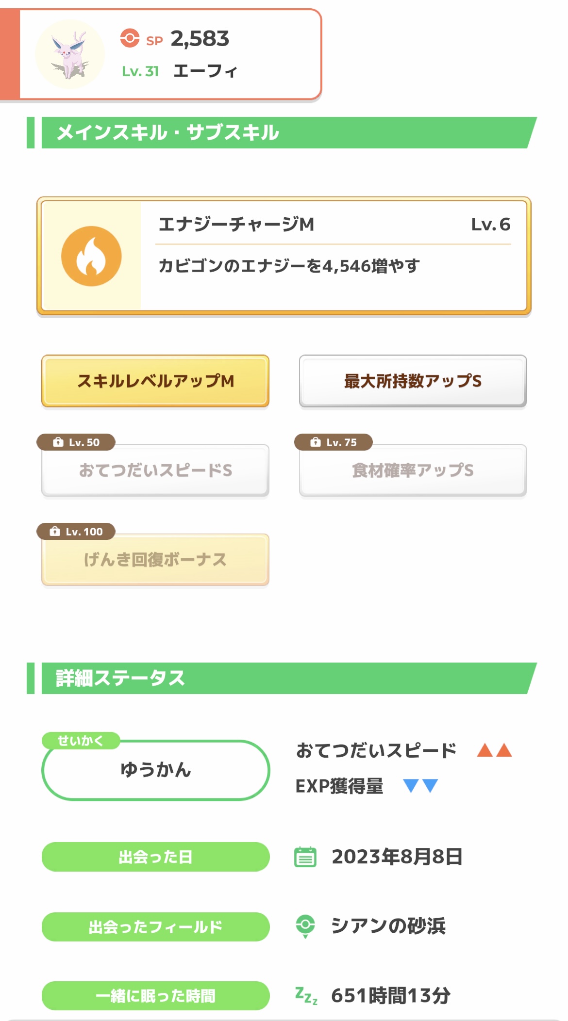 一匹目∶睡眠EXP,所持M,元気回復,おてスピM,食材M