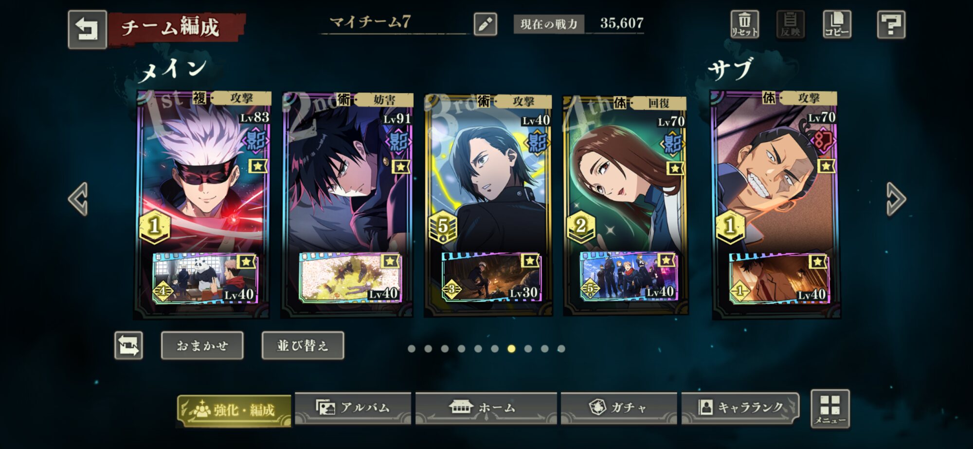 5ターン目:自分は狗巻につけてる残滓がHP残量が半分以下(だったと思う確か)で必殺ゲージ回復するものだからタイミングよく狗巻と五条が必殺技使えるけど使えないなら釘崎、狗巻、学長がもう一回通常攻撃、五条バフとかにすれば良いと思う(①→必殺ゲージが五条とその他誰かが溜まってる場合。②→必殺ゲージが五条しか貯まってない場合)