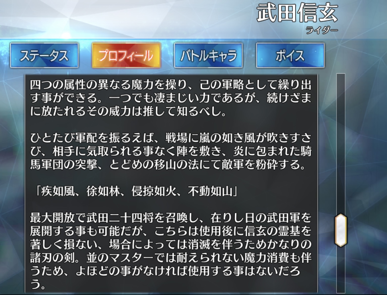 最大開放で武田二十四将を召喚し、在りし日の武田軍を展開する事も可能だが、こちらは使用後に信玄の霊基を著しく損ない、場合によっては消滅を伴うためかなりの諸刃の剣。並のマスターでは耐えられない魔力消費も伴うため、よほどの事がなければ使用する事はないだろう。