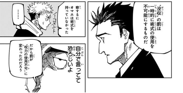 逆に誅伏賜死という領域の内部は日車の術式が必中になる(=ルールが強制される)ので【敗訴したらペナルティーとして術式の使用権や呪力の使用権等を停止する】という「奪う」縛りを強制できる…って感じやね