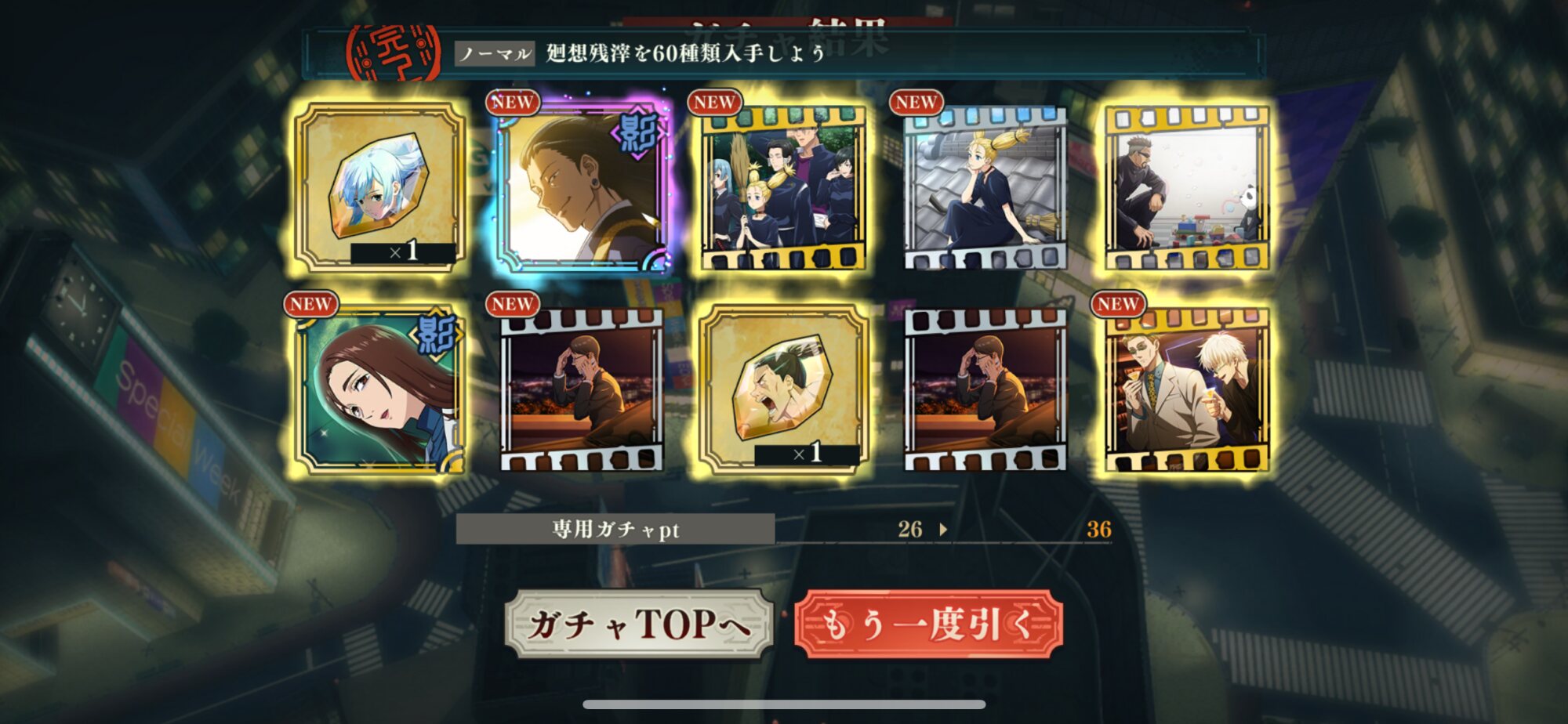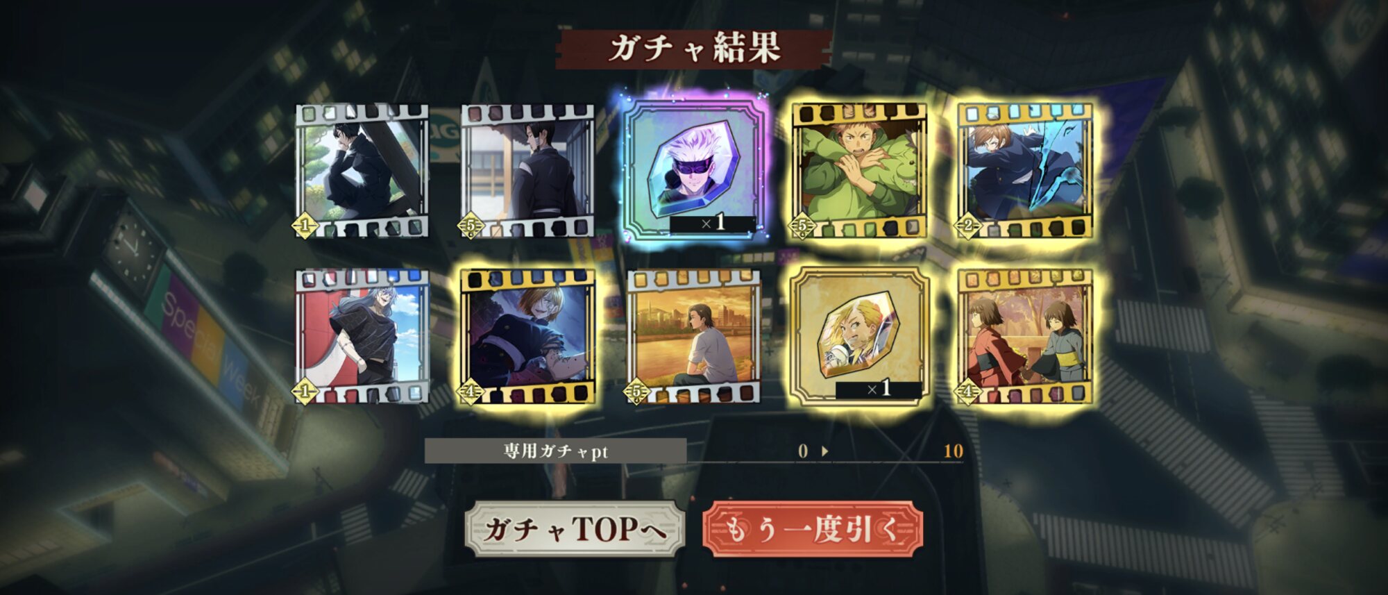 天井たたいてやっと出たんだけど、既に持ってる数少ないSSRの虎杖が2、ナナミンが2、棘が1ずつ来たんよ…