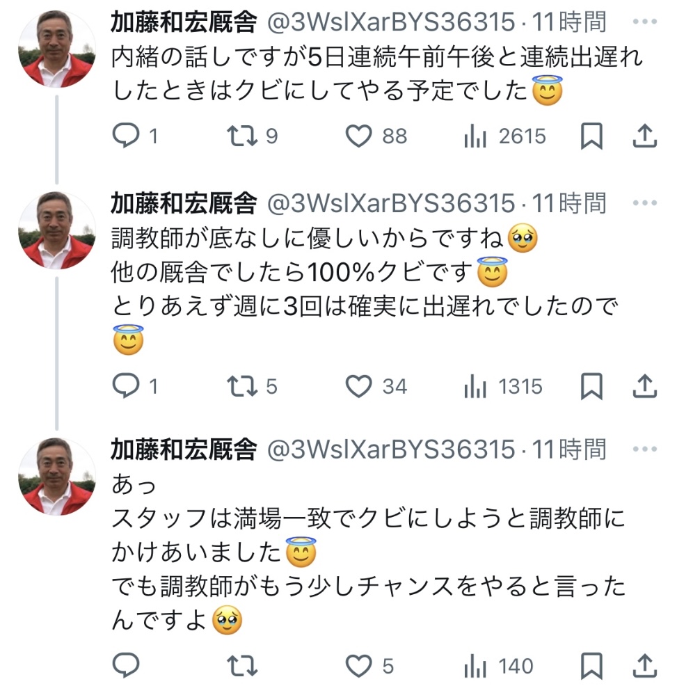 いやマジで他の厩舎だったら100%クビなってるなこりゃ