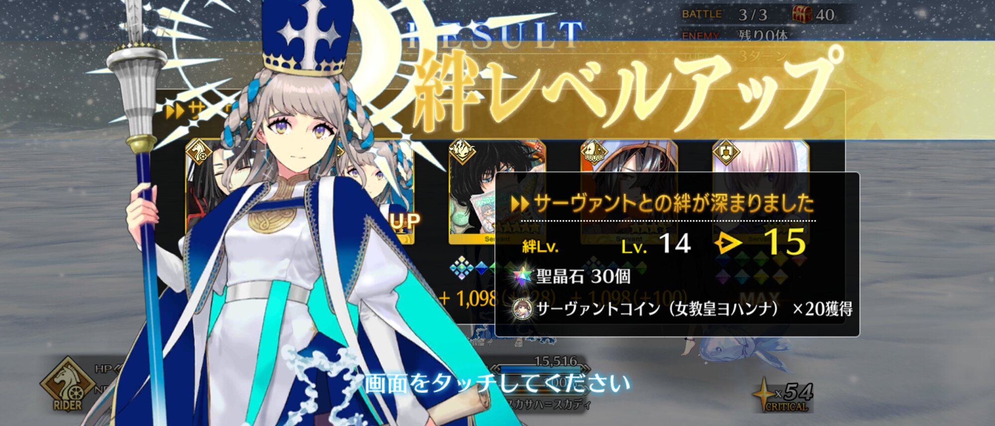 強化無効も便利らぶ!青と基調とした全身コーデはもちろん長い銀髪の髪は神々しさを増幅させているらぶ!最終再臨の朝日に照らされたヨハンナ様はまさしく教皇らぶ!