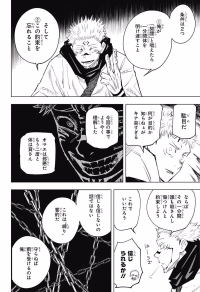これさ、1分間身体を「明け渡せ」だから虎杖自身の意思で宿儺に主導権を渡さなきゃいけないとかないよね?もしそうなら虎杖はこの約束を忘れてるから縛りを破ることになって宿儺が無条件で暴れられるとか…考えすぎか