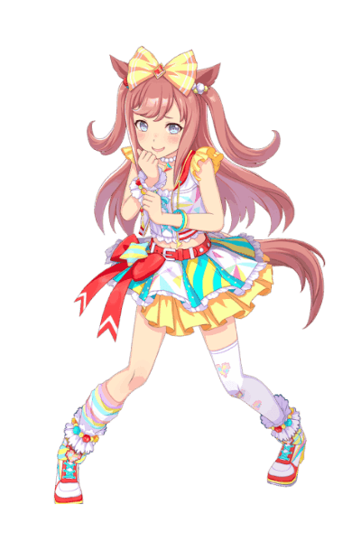 さらに現実の勝負服の色が元々カラフルだったせいで、ロリでパステルカラーでカラフルで露出が多い扇情的なデザインの勝負服のキャラになった上に、さらに私服までパステルカラー、ガチなロリの幼女がマジで着ていそうな私服になってしまった……