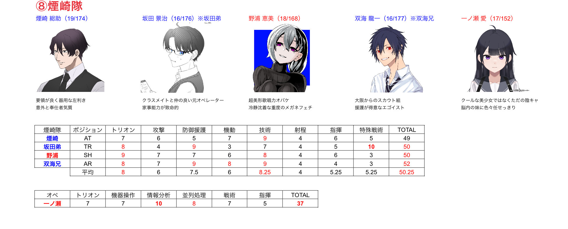 戦い方が想像しやすいのは南雲隊と煙崎隊かな