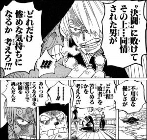 ヒルルクの死を侮辱したワポルにキレるも先にチョッパーが暴れたしドルトンの説得で自分も思いとどまる他にチョッパーの保護を優先したんかな