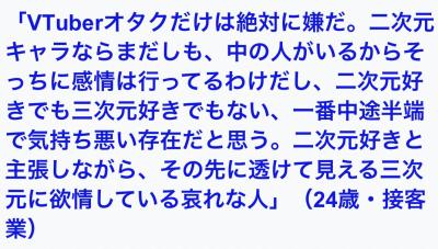 以来わざわざアンチ活動をするほどではないけど、なんとなくVtuberという業界そのものを毛嫌いするようになったのん - 62二次元好きの匿名さん24/01/13(土) 15:23:42