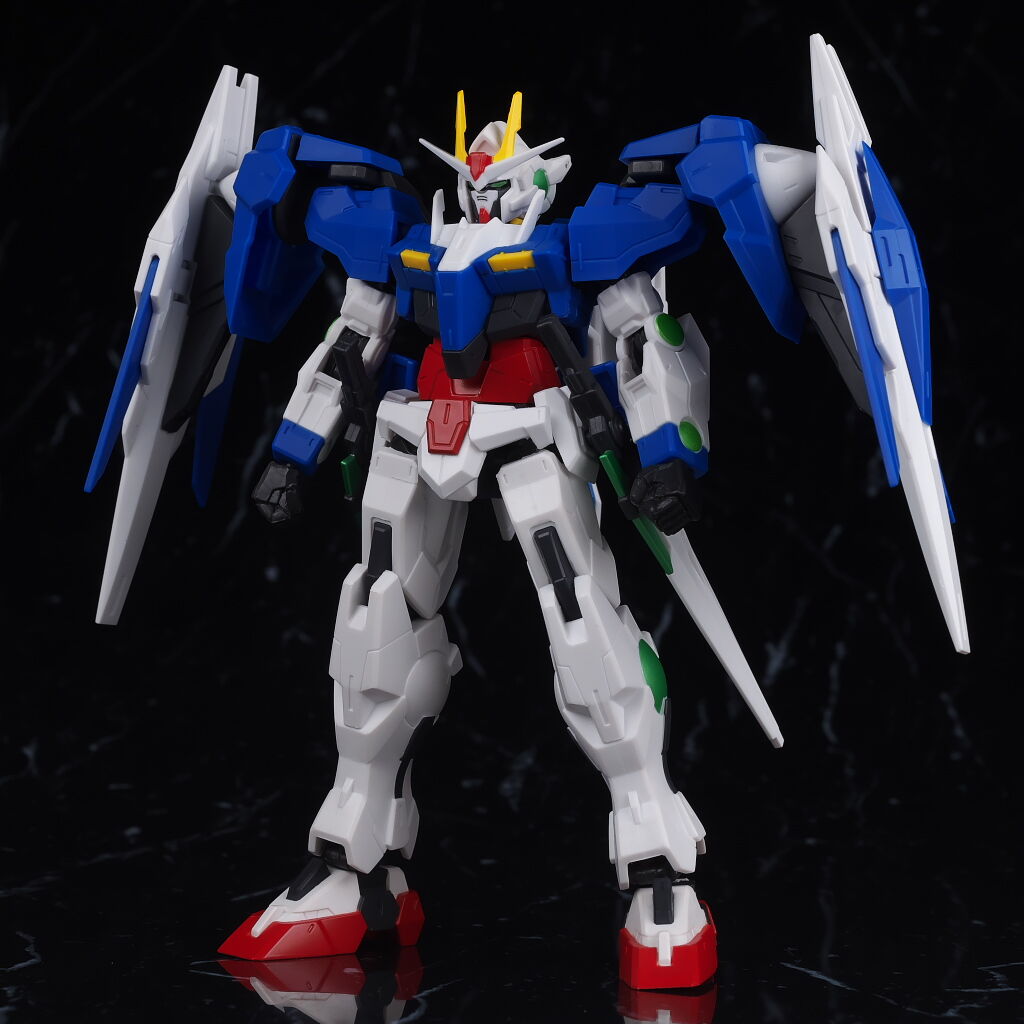 素の00と比べて全体的な見た目がゴテゴテしててスマートさが欠けてる印象だけど、まあ本来なら別々に運用する筈だった支援機を外部補助の調整ユニットとして無理矢理合体させる仕様に変えたんだから宜なるかな……勿論カッコいいけどね。でも個人的には00かクアンタくらいのボリュームがベストだと思う