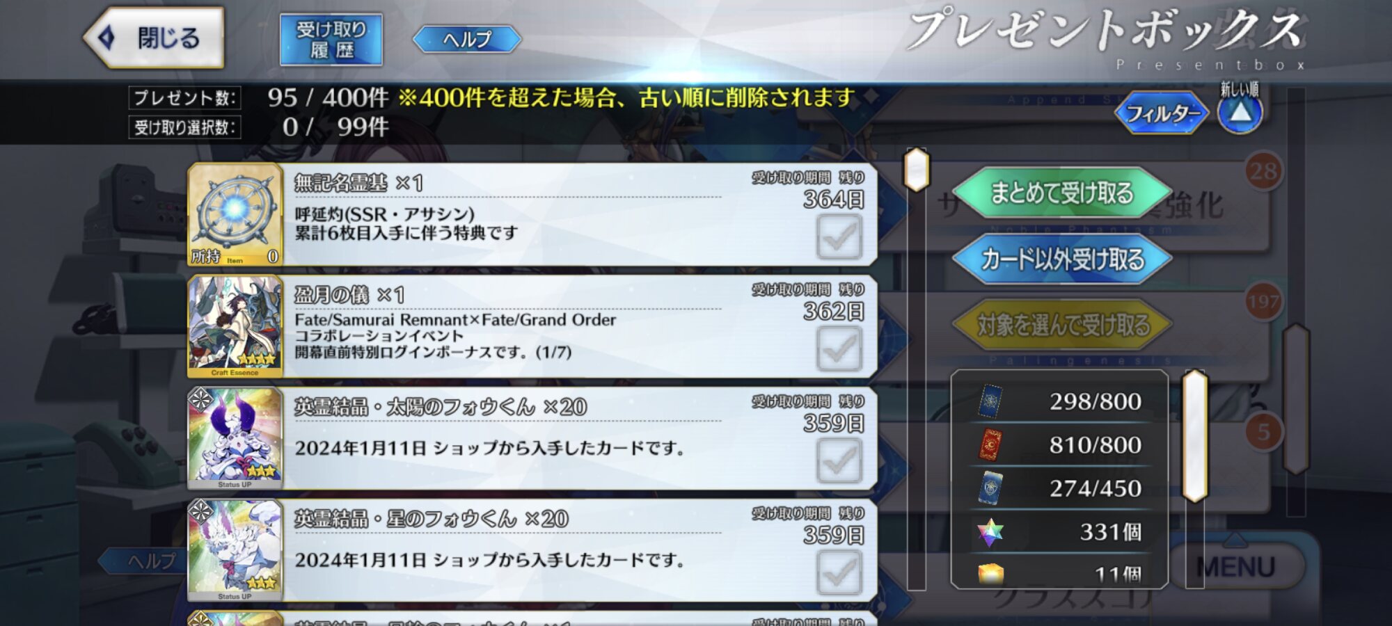 これで完全体呼延灼ちゃんをバッチリ作ることが出来るので万々歳です、ちなみに箱イベで稼いだ種火は余裕で足りませんでした