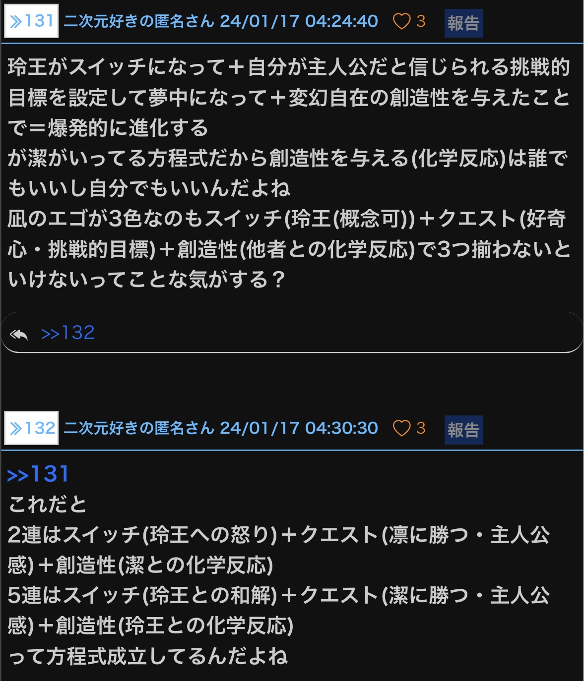 前スレ61の言うようにZ戦で元々のエゴが上塗りされて深層に沈められたのだとしたら、対比として今回はちゃんと能動のきっかけやモヤモヤや熱(エゴ)が何から来てるかと向き合えるってことになるのかな - 9スレ主◆Nc6kwGD/JM24/01/17(水) 10:23:00