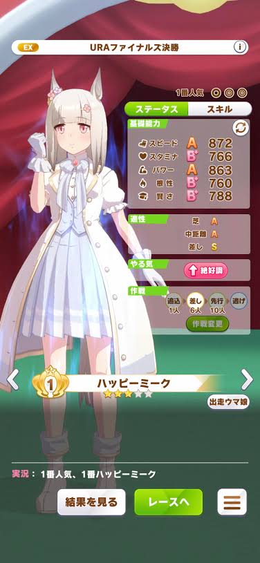 ただ勝ちすぎるとこの子のレベルも上がっていって、最後の最後のレースで出てくるハッピーミークのステータスが強くなるので、育成に慣れてないうちは負けてしまうことがある