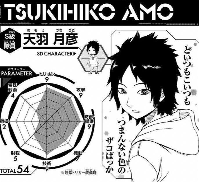 A級8位の片桐隊の隊長でポジションは銃手。名前と姿のチラ見せ自体は最序盤やBBFにて披露されていたものの、本格的な登場は単行本23巻以降になる。
