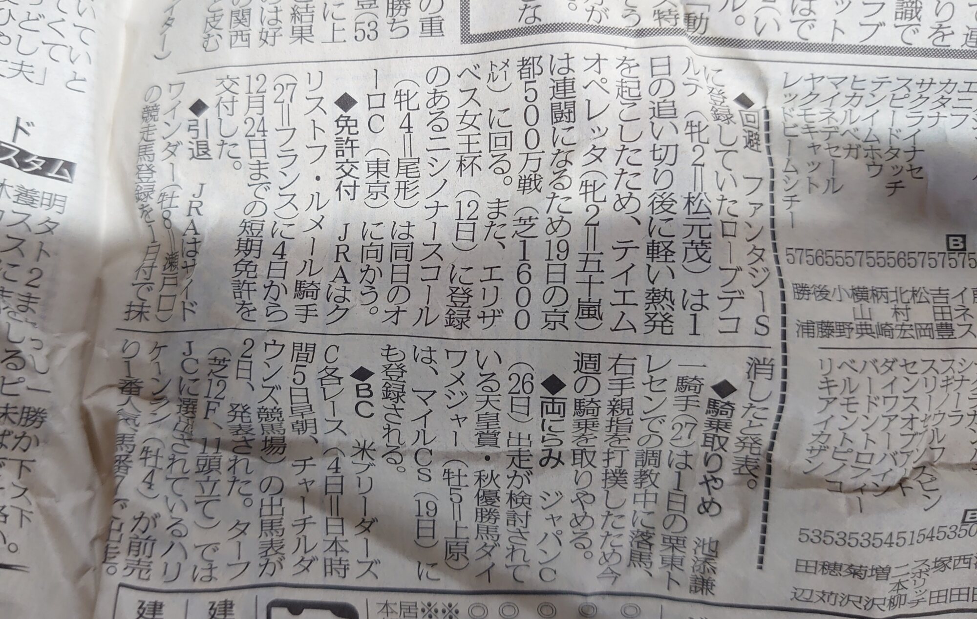 中古屋俺、梱包に使われてた新聞に2019有馬記念の馬柱を見つけそっ閉じ
