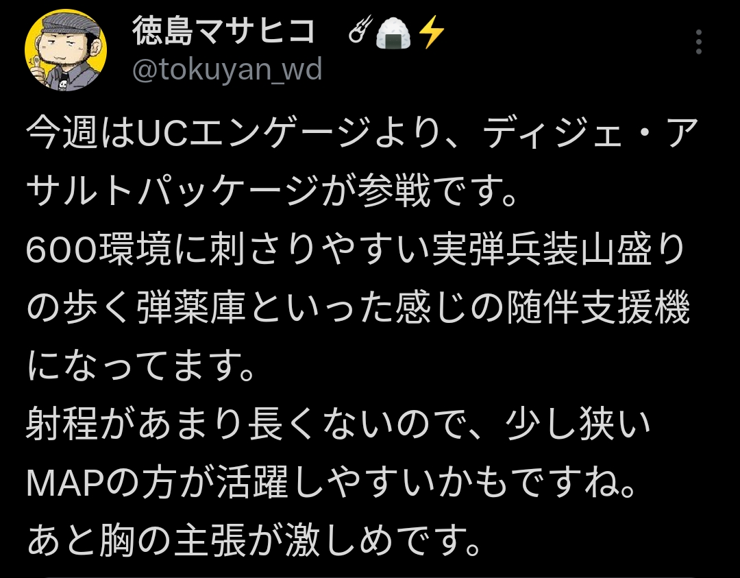 色々文句あるけど楽しいのも事実なんだよなぁ。モデリングカッコいいしエクバじゃ使えないようなマイナー機体も使える。野良で上手いこと連携できたらテンション上がるし相手を綺麗に捌けたら満足感あるし。基本の戦闘システムに関しては歩兵以外に不満点無いからその辺も自分には合ってる気がする。楽しい部分が多いからこそそれを邪魔する要素が際立って見えるのかな。まあ心が荒むっていっても次の日になったらまた普通に遊んでるから大した事ではないんだけと