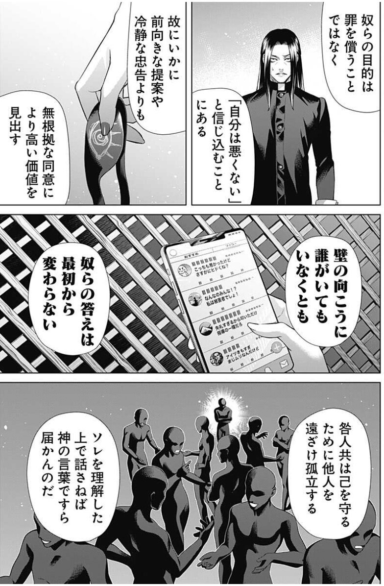 何なら漆原は自分の信条をまげてクズを弁護して勝訴しても自分が味方した=当たり籤を選んだとは思わず処刑して牙頭は(神父の言葉を借りるなら)他人の強さというまやかしを信じてるからな