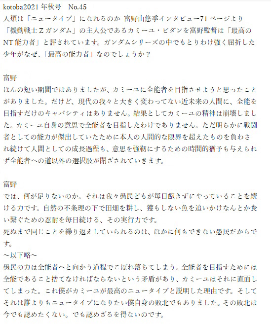 こう見るとアムロの"死人に引っ張られる"って発言は富野監督のインタビューで述べられてるNTのその先への目覚めだったりするんだろうか