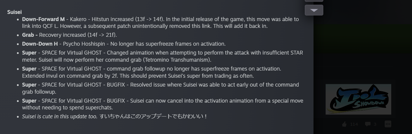 ホロ格ゲーのアップデートの内容を覗いて見ると開発に星詠みがいることが一目でわかるぜ