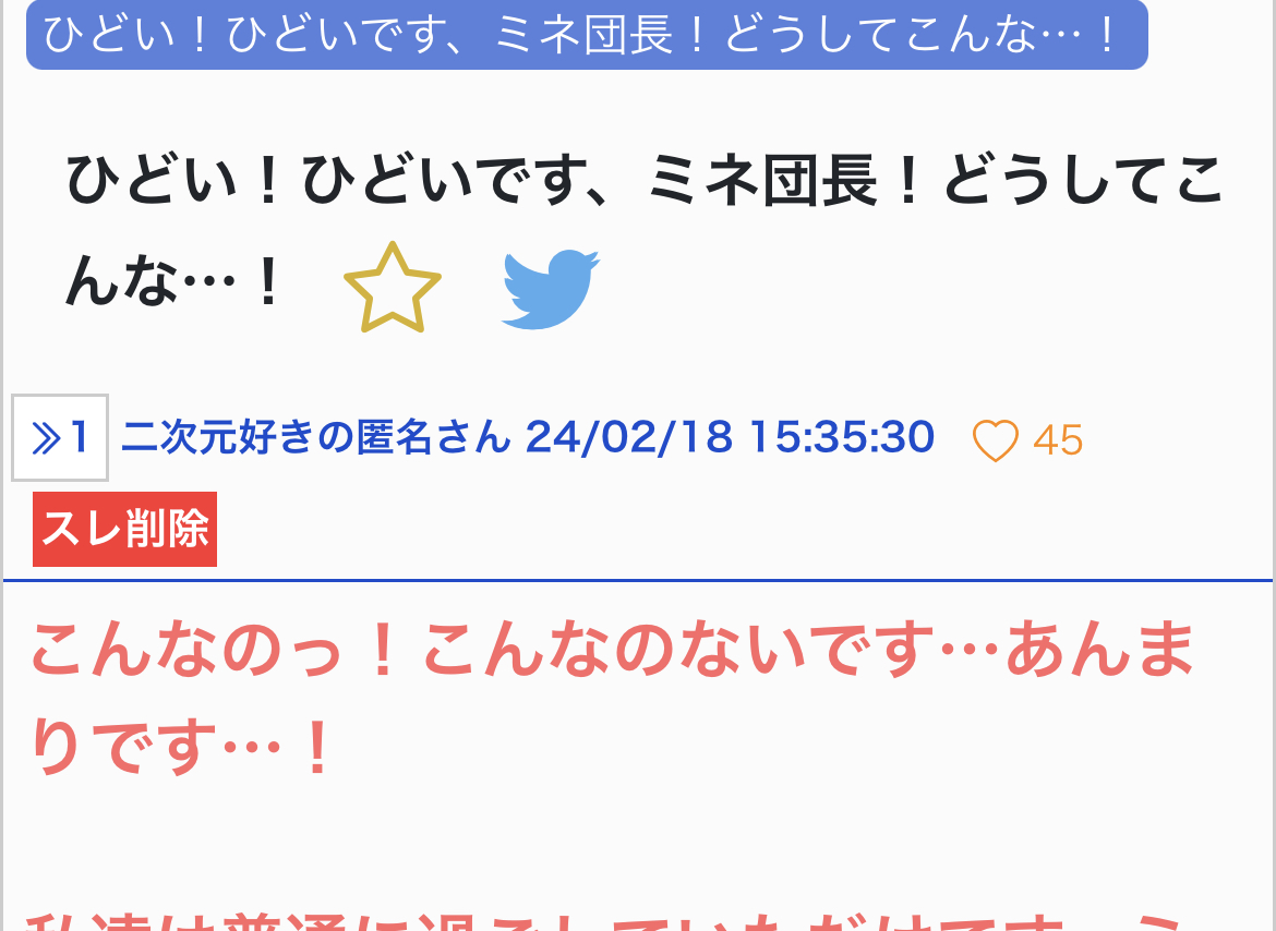 ひどい!ひどいです、ミネ団長!どうしてこんな…!|あにまん掲示板こんなのっ!こんなのないです…あんまりです…!私達は普通に過ごしていただけです。ミカ様のデモに参加したこともないですよ!悪いことなんて何もしていません!勉学も真面目に取り組み、運動も欠かさず行ってます…bbs.animanch.com - 2二次元好きの匿名さん24/02/19(月) 20:35:37