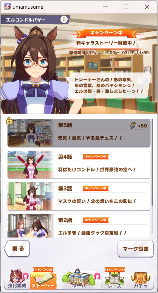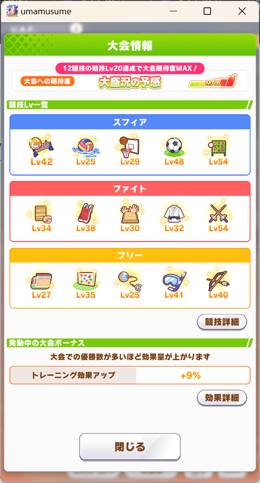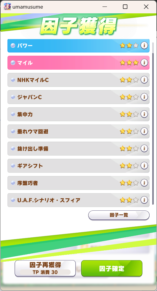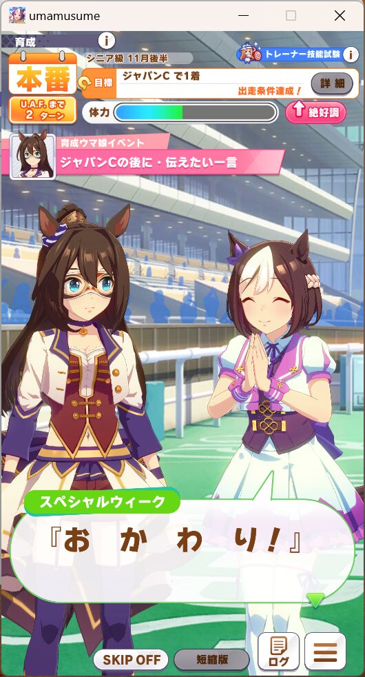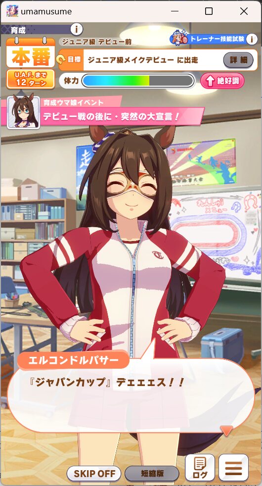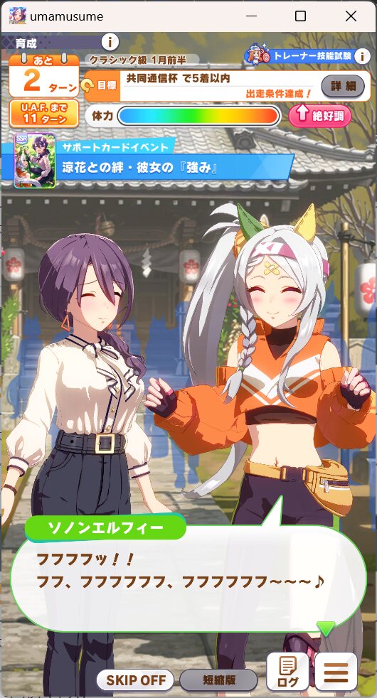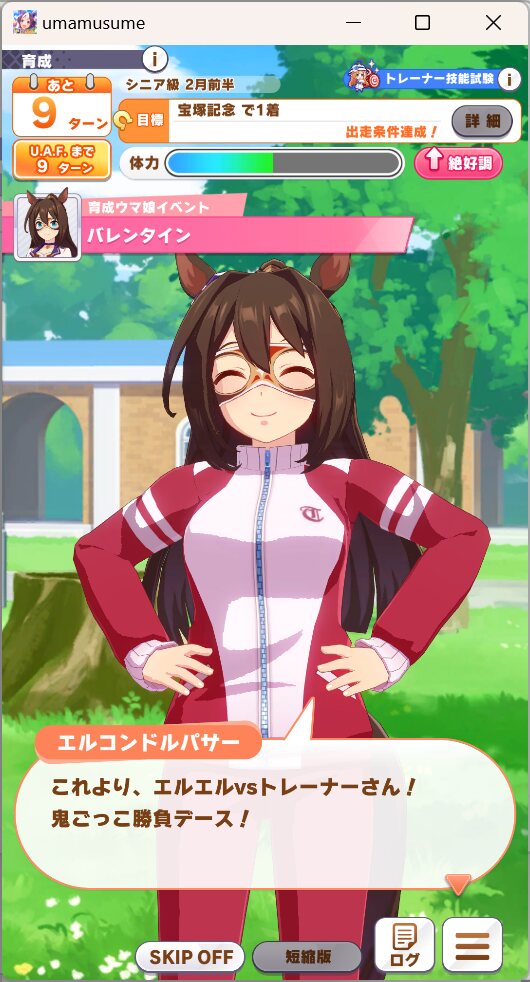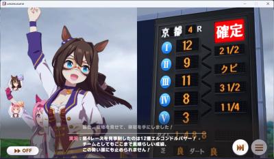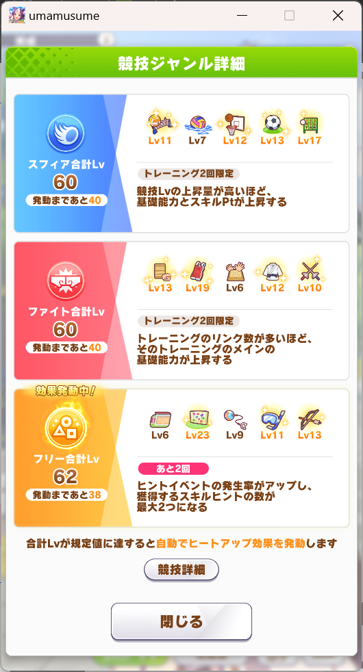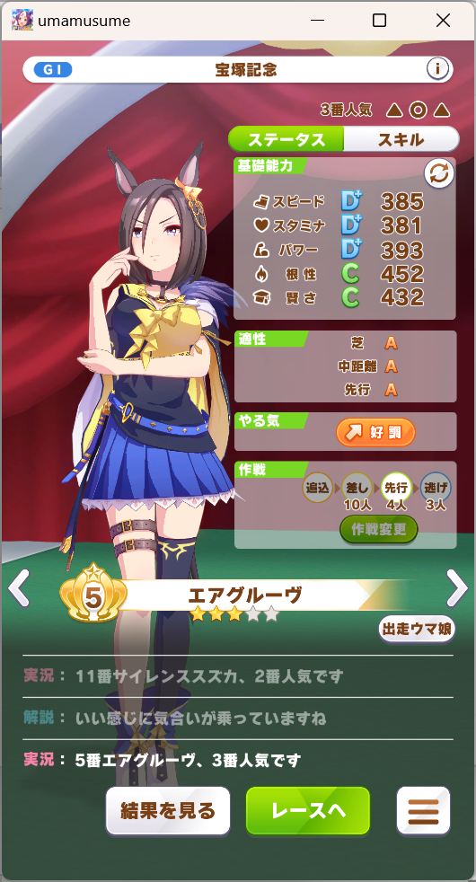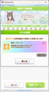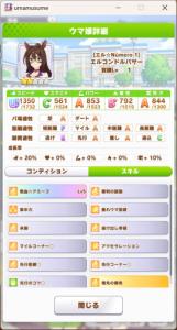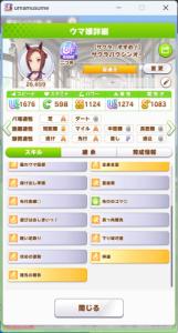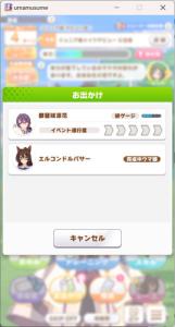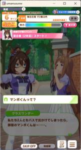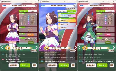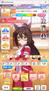 一応さっきの構成をいい感じのカードに差し替えたバクシンを短距離検定に入れて短距離唯一の(重要)エースを強化しながら金結晶の回収と昇格地固めをします