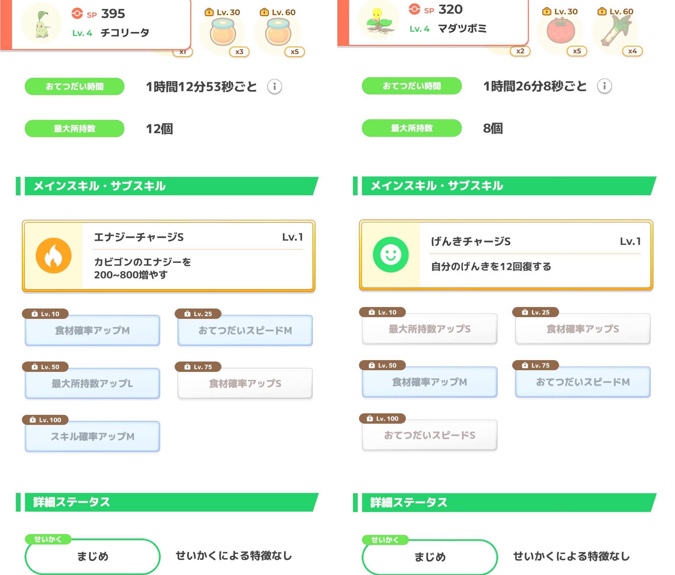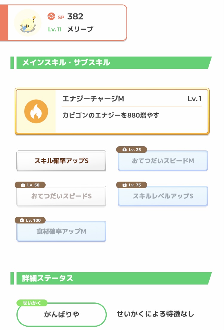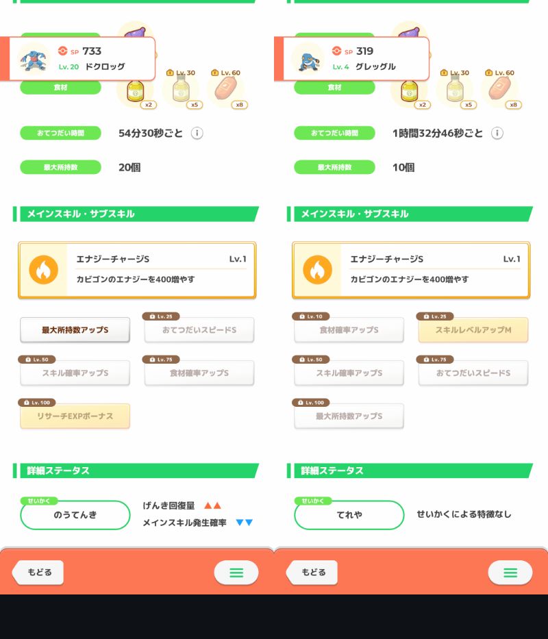 右は食材確率Sなので使うなら銀種必須で進化28レベルと遠いので、焦らず飴集めがてら厳選をして他に良いのがいなかったら採用かな
