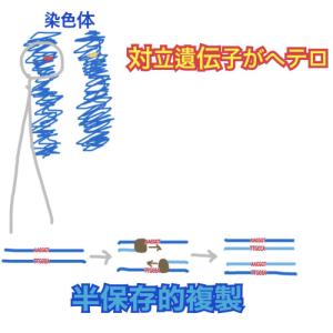 半保存的複製とは、新しい2本鎖DNAのうち1本だけ鋳型となった鎖であり、もう一方が新しく合成された鎖である複製の事を指します