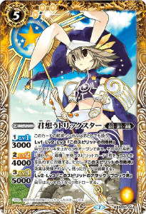 ネタ方面の原作再現なら99回コンティニューが可能な創界神ネクサスの新檀黎斗(実写イラストの檀黎斗神もいる)や条件を満たさないと手札でのコストが1000になるサウザンドアーク、ブレイドがバトルしている間限定で効果耐性を持つことで何故か見てる仮面ライダーギャレン(ついでにコスト3ながらレベル3になると格上を倒せるぐらい強くなる)なんかがいる