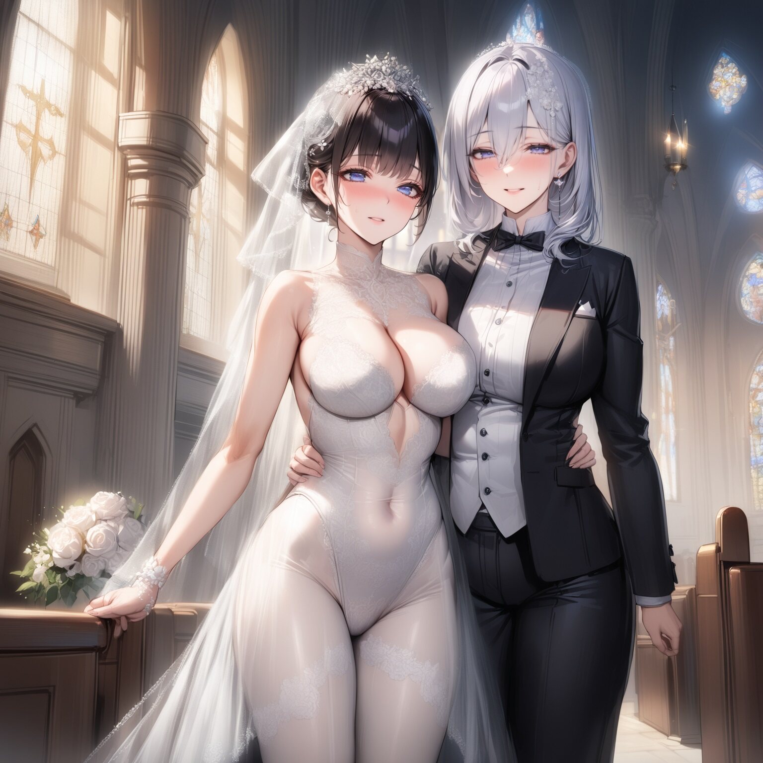 {masterpiece portrait}, 1girl, {dark brown hair, long hair, gold hair, [[huge breasts]], wet, {sweat}, bedroom,bride see-through, {{wedding_dress}}, bridal_veil, micro bikini, gloves, socks, hair_flower, church, window,